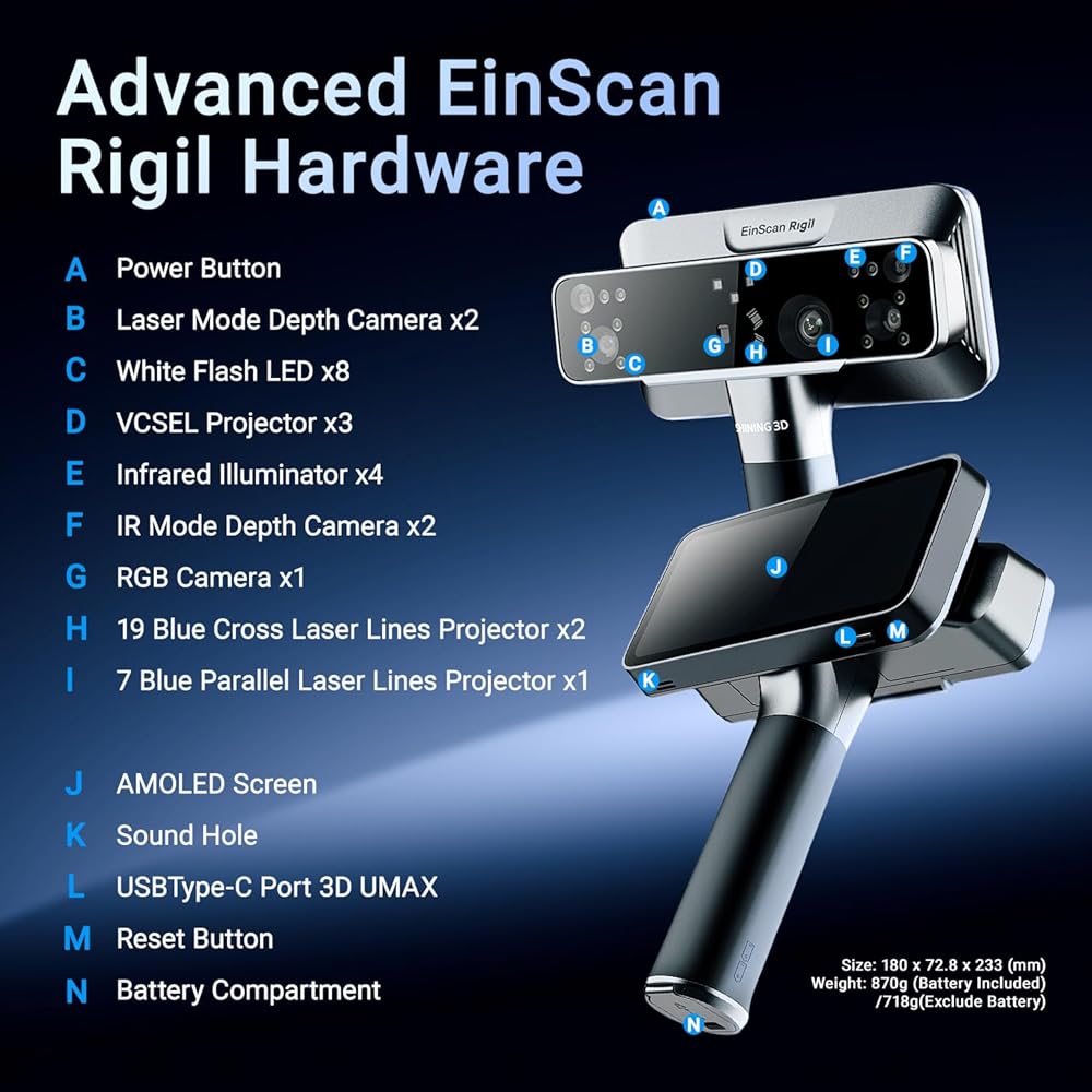 أداء محمول وسريع وفعال: مدعوم بوحدة معالجة مركزية 2.4 جيجا هرتز، وذاكرة وصول عشوائي DDR5 سعة 32 جيجا بايت، ومحرك أقراص SSD سعة 1 تيرابايت، يضمن EinScan Rigil التشغيل السلس وسرعات المعالجة السريعة. تعمل شاشة اللمس AMOLED مقاس 6.4 بوصة بدقة 2K على تحسين سهولة الاستخدام، وتسمح لك البطاريات القابلة للاستبدال، إلى جانب التوافق مع ضوء الشمس، بإجراء المسح الضوئي أثناء التنقل، حتى في الهواء الطلق.