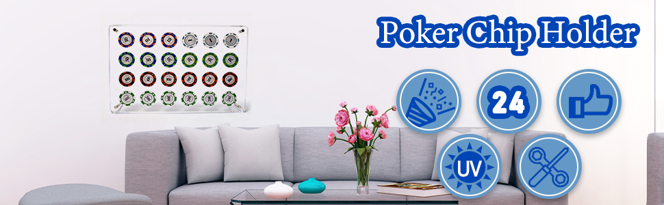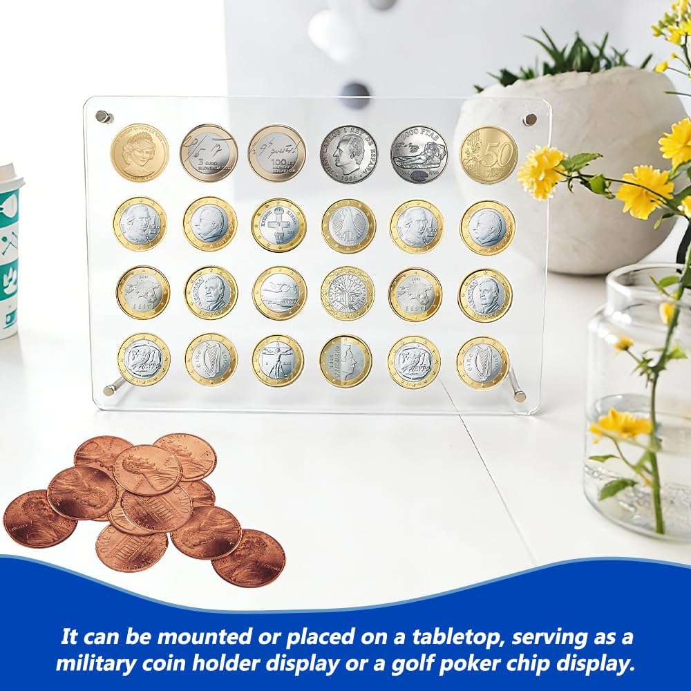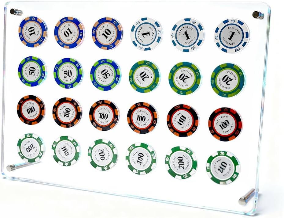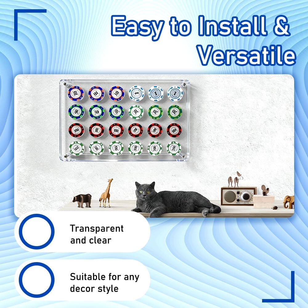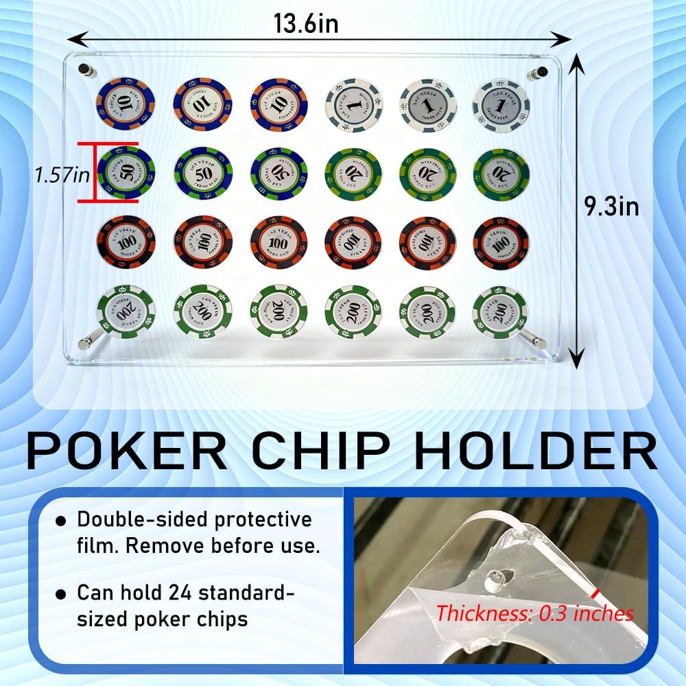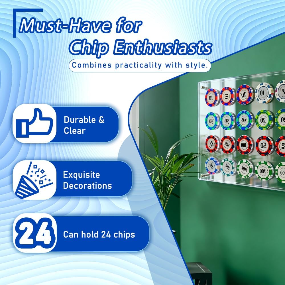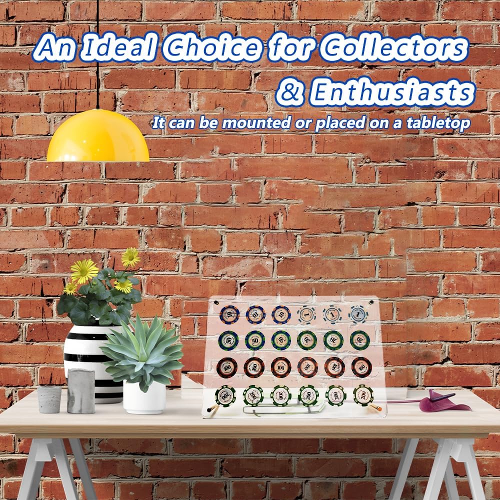 24 قطعة من حامل شرائح الكازينو، حافظة عرض شرائح البوكر الأكريليك، عرض عملة التحدي للعملات التذكارية لرقائق البوكر، مثبتة على الحائط أو الطاولة (13.6 × 9.3 بوصة)