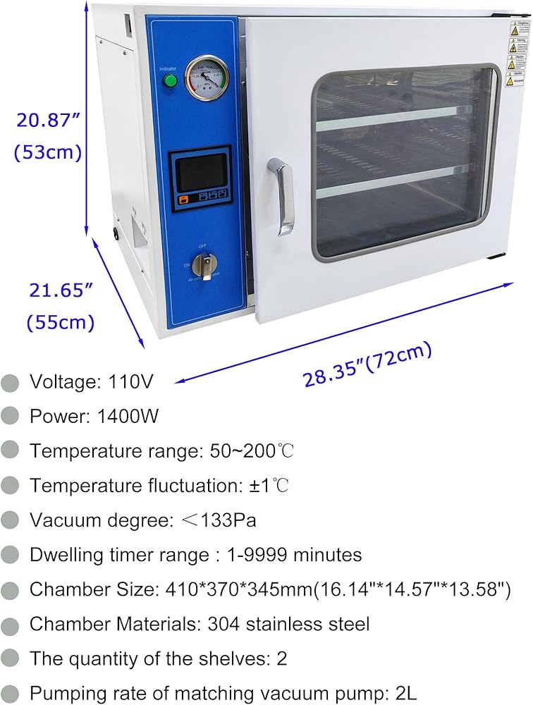 • [Parameters]:Voltage: 110V; Power: 1400W;Temperature range; 50~200℃; Temperature fluctuation: ±1℃; Vacuum degree:<133Pa; Dwelling timer range :1-9999 minutes; Chamber Size:410*370*345mm (16.14"*14.57"*13.58"); Chamber Materials: 304 stainless steel; The quantity of the shelves: 2 ; Pumping rate of matching vacuum pump: 2L.