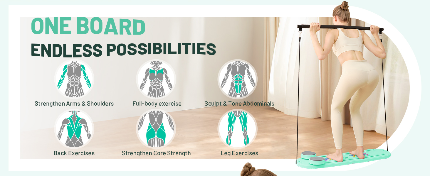 • 𝐍𝐨 𝐌𝐨𝐫𝐞 𝐁𝐨𝐫𝐢𝐧𝐠 𝐖𝐨𝐫𝐤𝐨𝐮𝐭𝐬 — This multifunctional pilates reformer board lets you combine resistance, balance, and core training to target your abs, arms, legs, and glutes—all in one system. Mix and match different exercises to stay motivated and keep every session fresh, engaging, and effective.