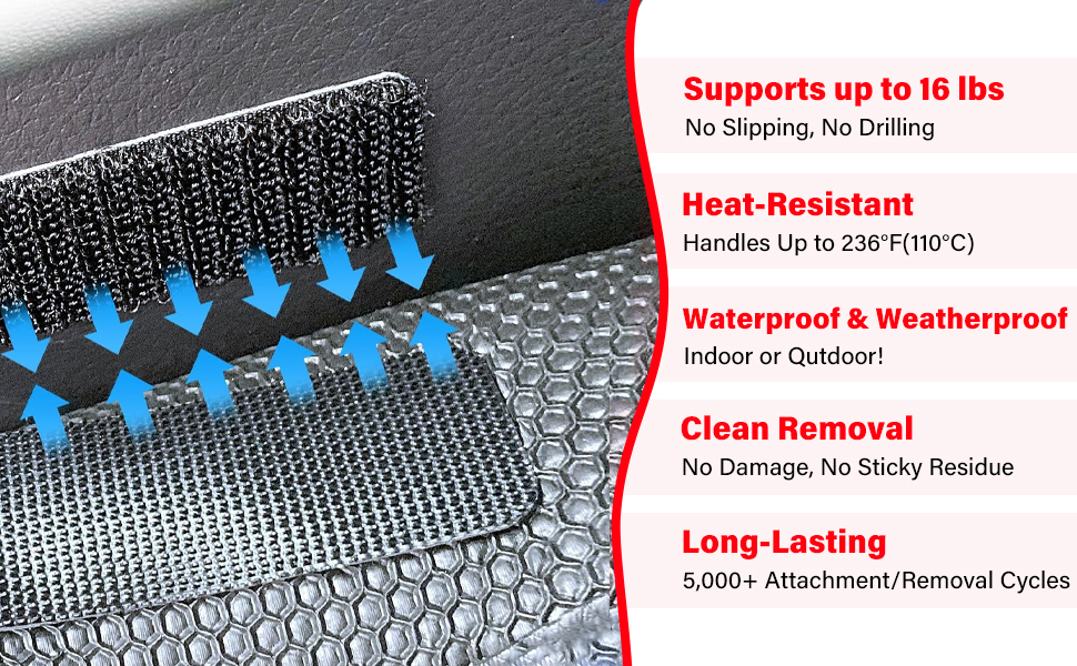 • استخدام واسع: مناسب للاستخدام الخارجي والداخلي. جميع أنواع الحلول المؤقتة لتركيب العناصر القابلة للإزالة، مثل وسائد الأريكة، والسجاد، وسجاد السيارة، والستائر، وأجهزة التحكم عن بعد، وإطار الصور المعلق، وأعمال التركيب اليدوية، وتنظيم أدوات المرآب، وشريط الطاقة وتنظيم الكابلات، وإضاءة LED، والديكورات، وألواح المسح الجاف والمزيد