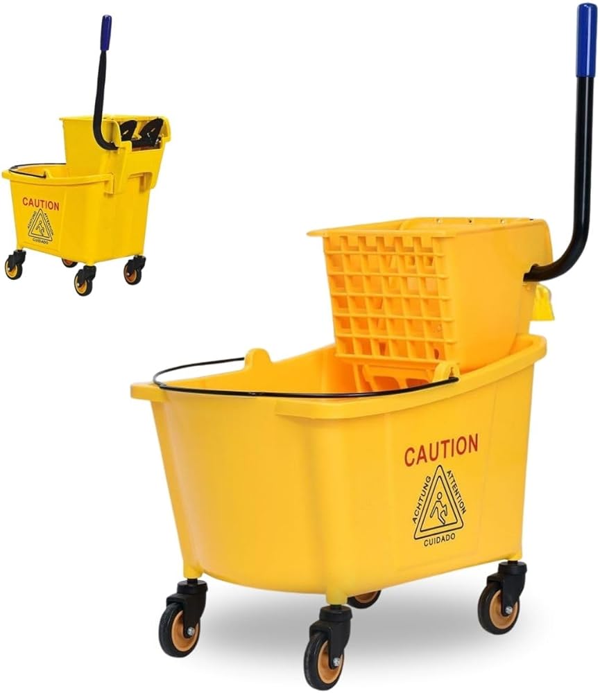 This mop bucket features thoughtful design with wringer eliminating manual wringing, mesh drainage preventing residue, and a splash guard keeping floors dry. Mop bucket with wringer set large capacity reduces water changes, while the recirculating filtration system saves water. The extended handle reduces bending fatigue, and the rubber non-slip grip ensures comfortable handling and prevents slipping. 4 premium swivel wheels ensure smooth gliding and flexible manoeuvring. Constructed from thickened and high-quality PP plastic, the portable mop bucket is robust and sturdy.