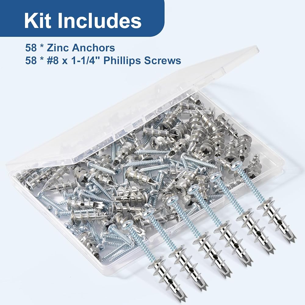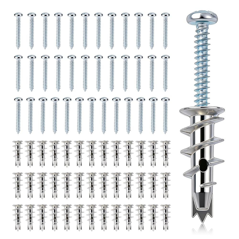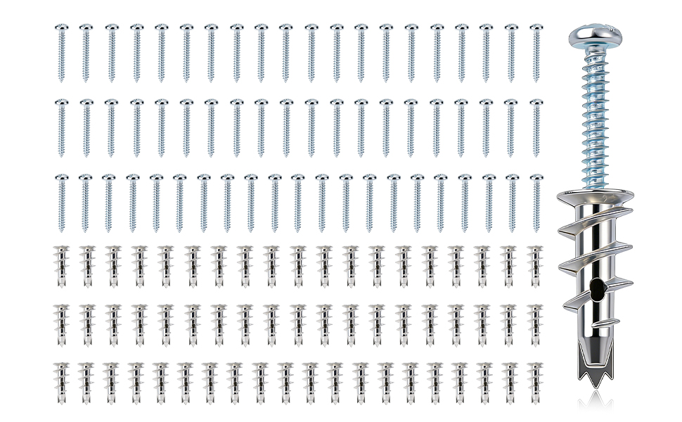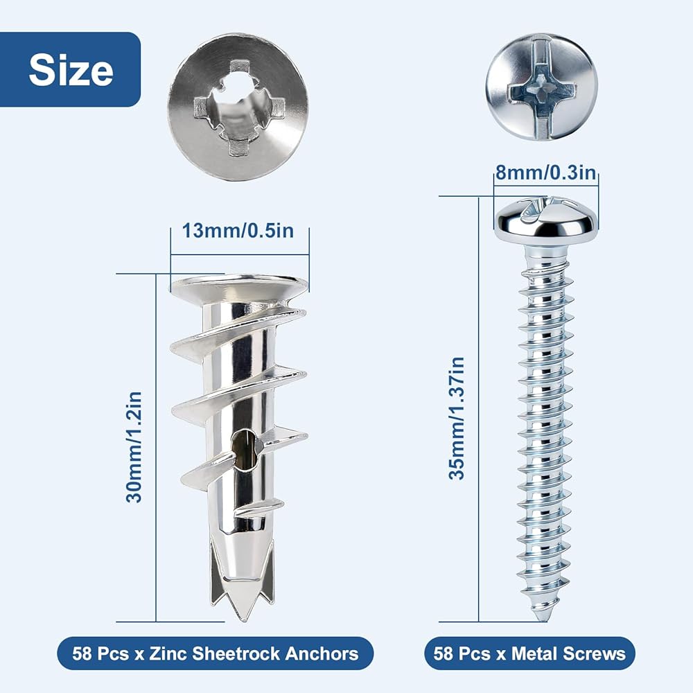 【ما تحصل عليه: سوف تحصل على مجموعة كاملة من أدوات تثبيت ومسامير الحوائط الجافة، بما في ذلك 58 مرساة حائط معدنية من الزنك و58 براغي #6 × 1-1/4 بوصة. إذا كان لديك أي مخاوف أو تريد معرفة المزيد عن منتجاتنا، يرجى فقط الاتصال بنا