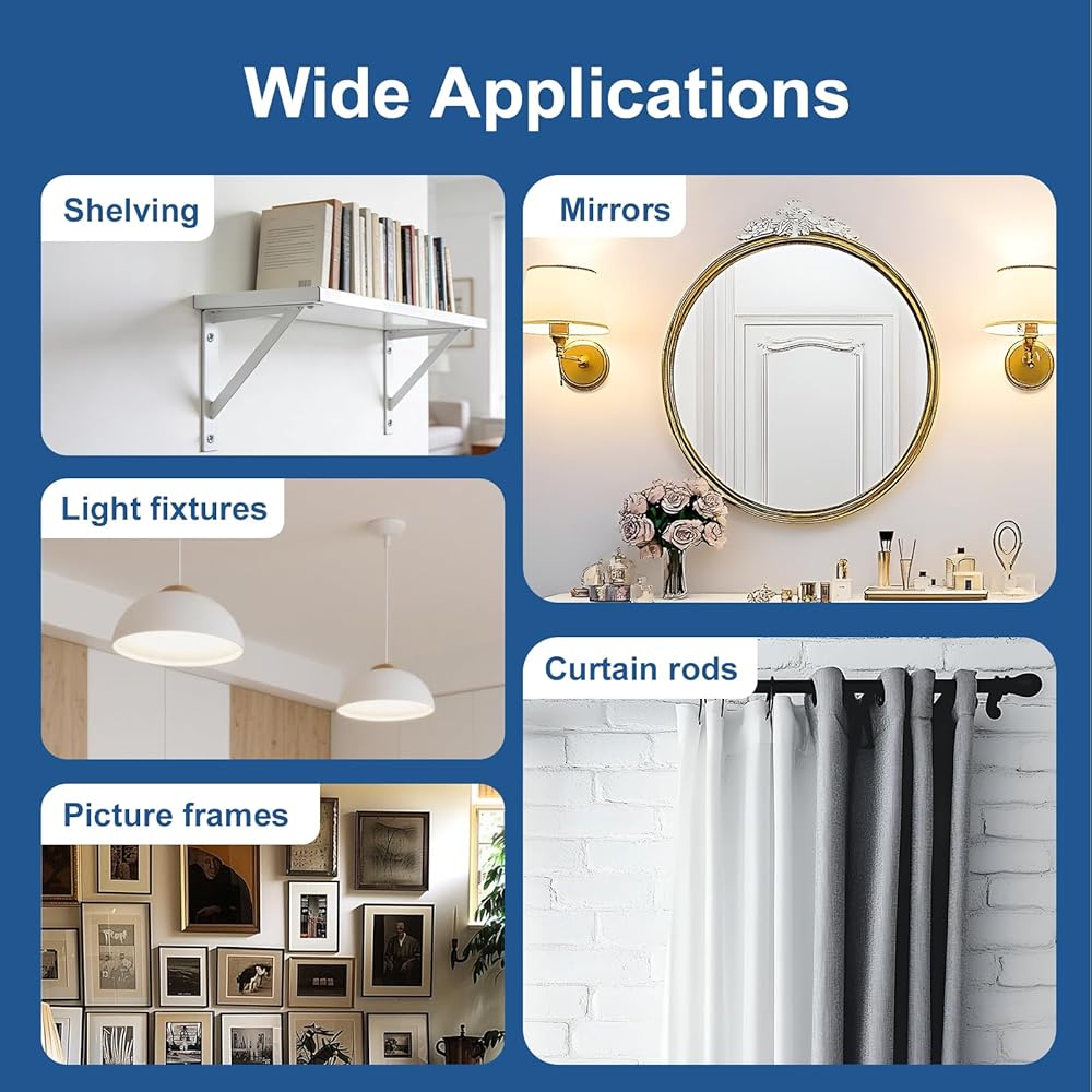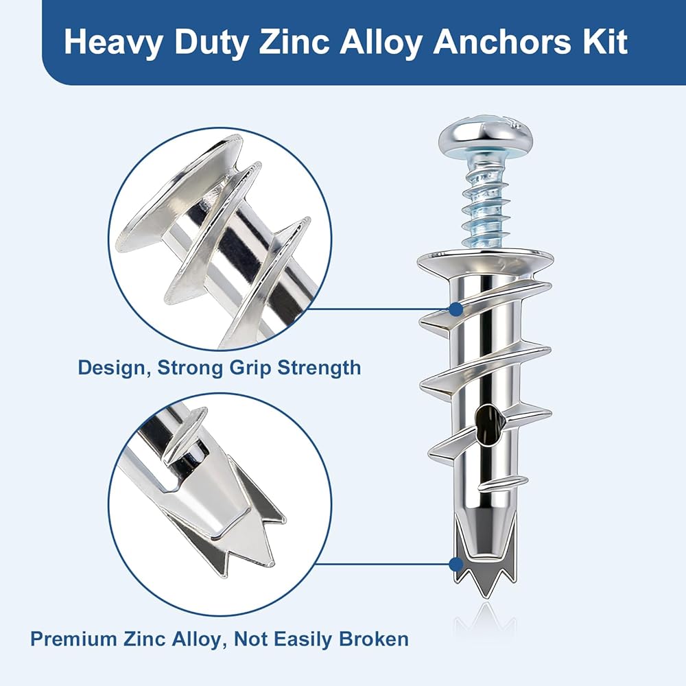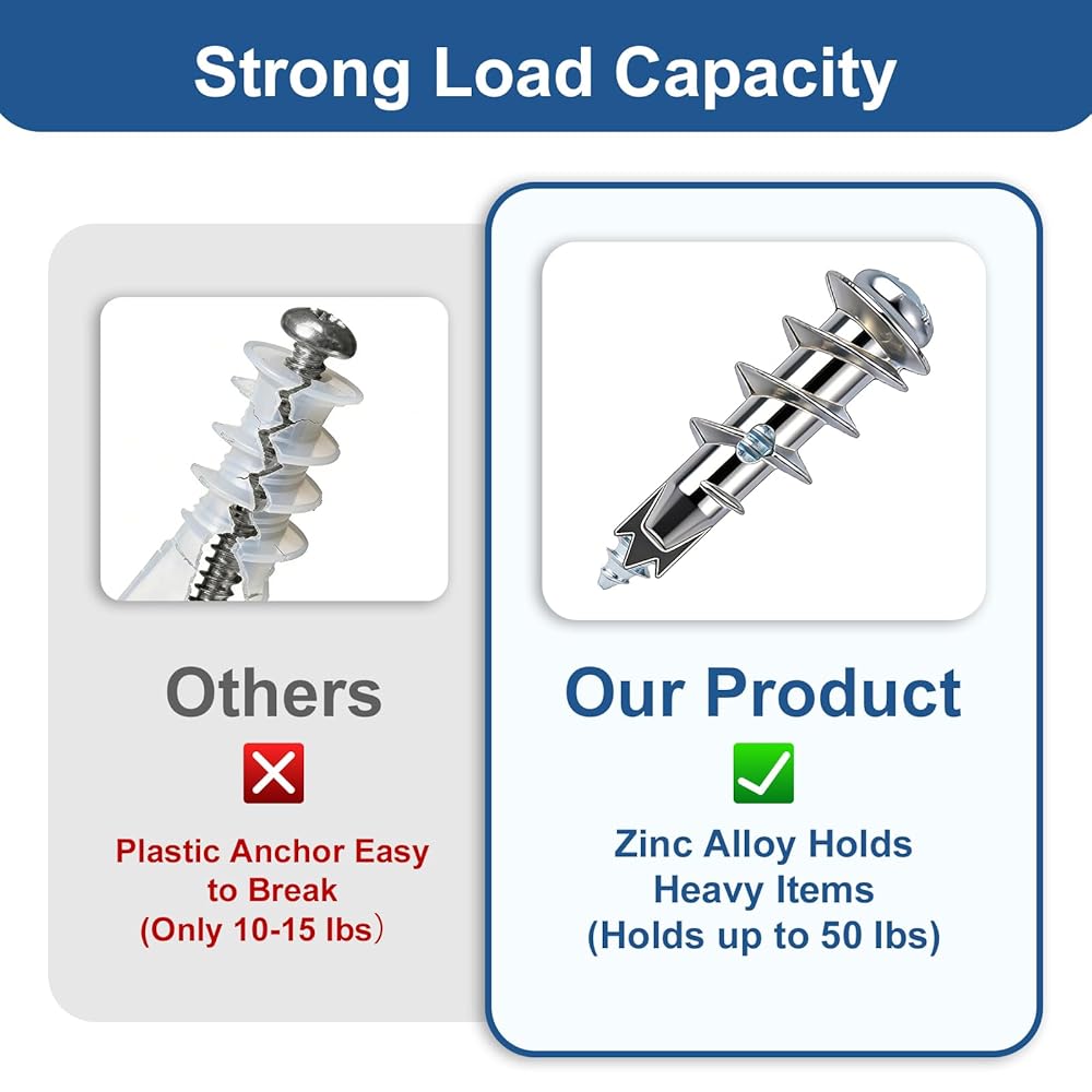 【مثبتات جدارية شديدة التحمل】 يوفر هيكل الزنك عالي التحمل لدينا متانة طويلة الأمد مع قدرة تحمل تصل إلى 50 رطلًا. يوفر تثبيتًا قويًا وآمنًا للأرفف والمرايا والتركيبات دون إتلاف جدارك الجاف، مما يمنحك دعمًا ثابتًا يمكنك الوثوق به.
