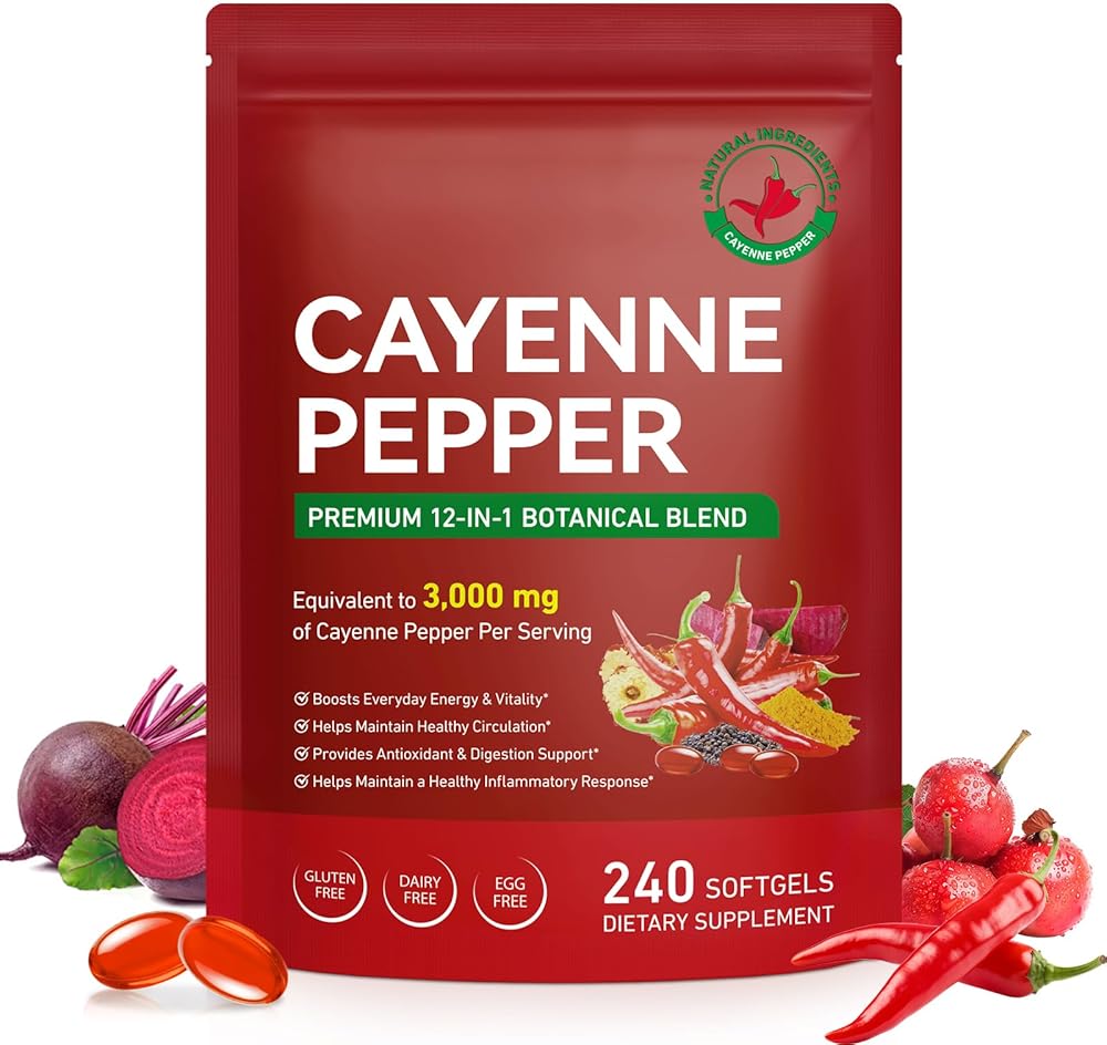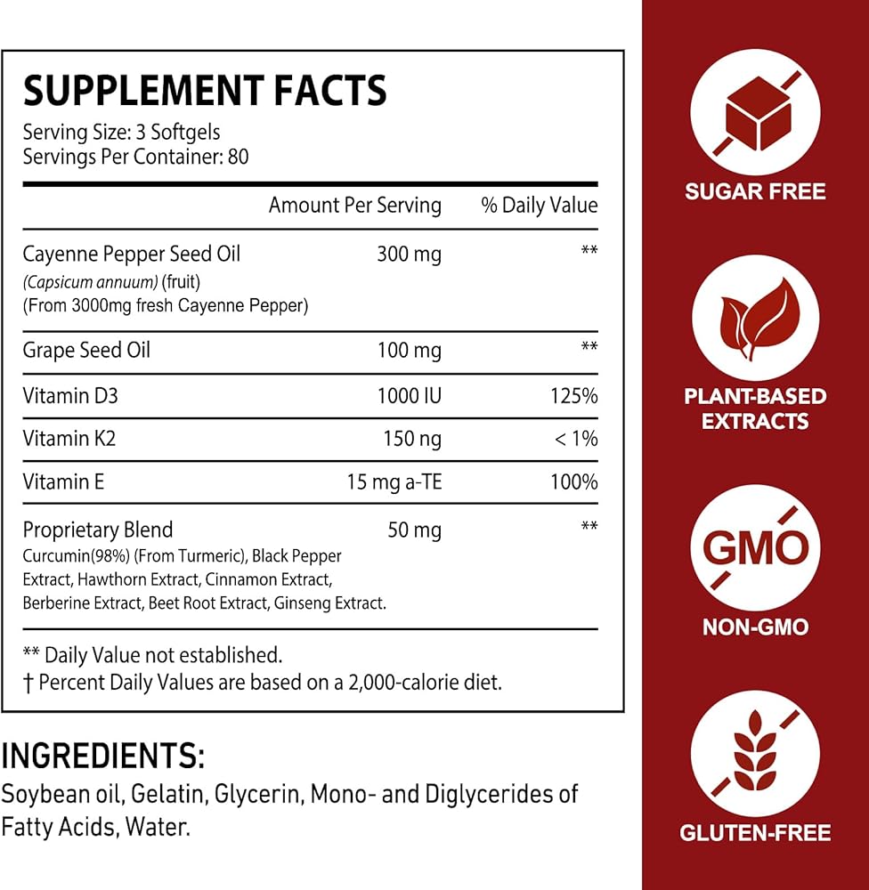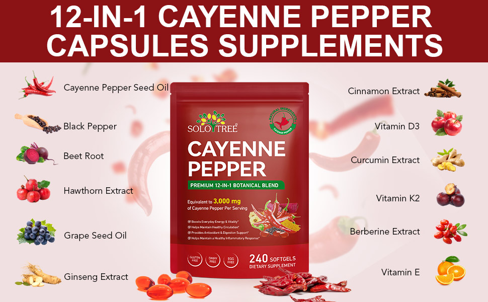 🌶️【12 في 1 كبسولات فلفل كايين ناعمة】تتميز كبسولات الفلفل الحار لدينا بمزيج مركب علميًا من 12 مكونًا نباتيًا: زيت بذور كايين، بذور العنب، فيتامين D3، K2، E، الكركم، الفلفل الأسود، الجينسنغ، الزعرور، القرفة، البربارين، والشمندر. تم تصميم هذه الصيغة الشاملة لتوفير الدعم الغذائي لنظام القلب والأوعية الدموية، وصحة الجهاز الهضمي، والعافية بشكل عام.