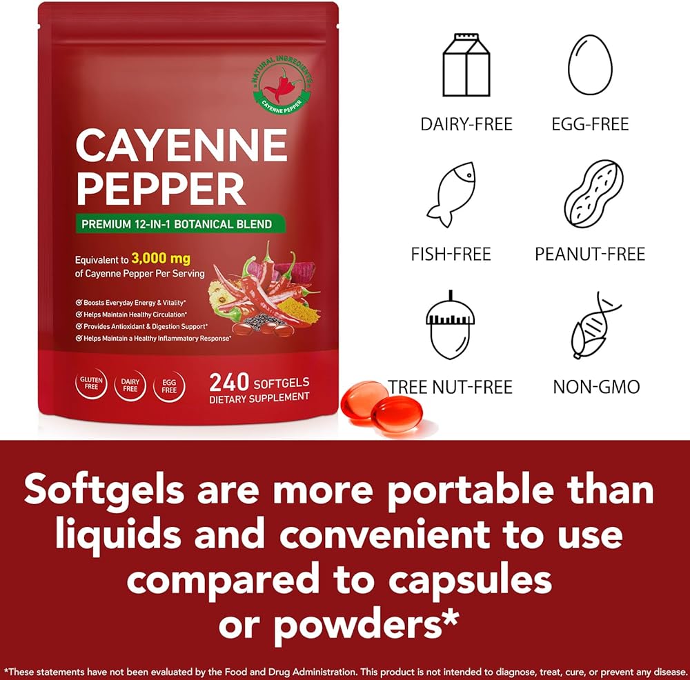 🌶️【مكمل يومي مريح】تحتوي كل حقيبة على 240 كبسولة هلامية (3 يوميًا لمدة 80 يومًا). هذه الكبسولات الطرية بالفلفل الحار صغيرة الحجم وسهلة البلع ومصنوعة بدون إضافات قاسية. إنها غير معدلة وراثيًا، ويتم امتصاصها بسرعة، وأكثر قابلية للحمل من السوائل أو المساحيق، مما يجعل من السهل دعم روتينك الصحي اليومي في أي وقت وفي أي مكان.