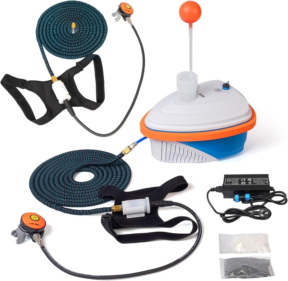 دعم 2 غواصين: يمكن للضاغط الذي يعمل بالبطارية توفير 60 لترًا من الأكسجين في الدقيقة، مما يدعم ما يصل إلى غواصين. الحد الأقصى للعمق للغواص الواحد هو 60 قدمًا / 18 مترًا، بينما الحد الأقصى للعمق للغواصين هو 16 قدمًا / 5 مترًا