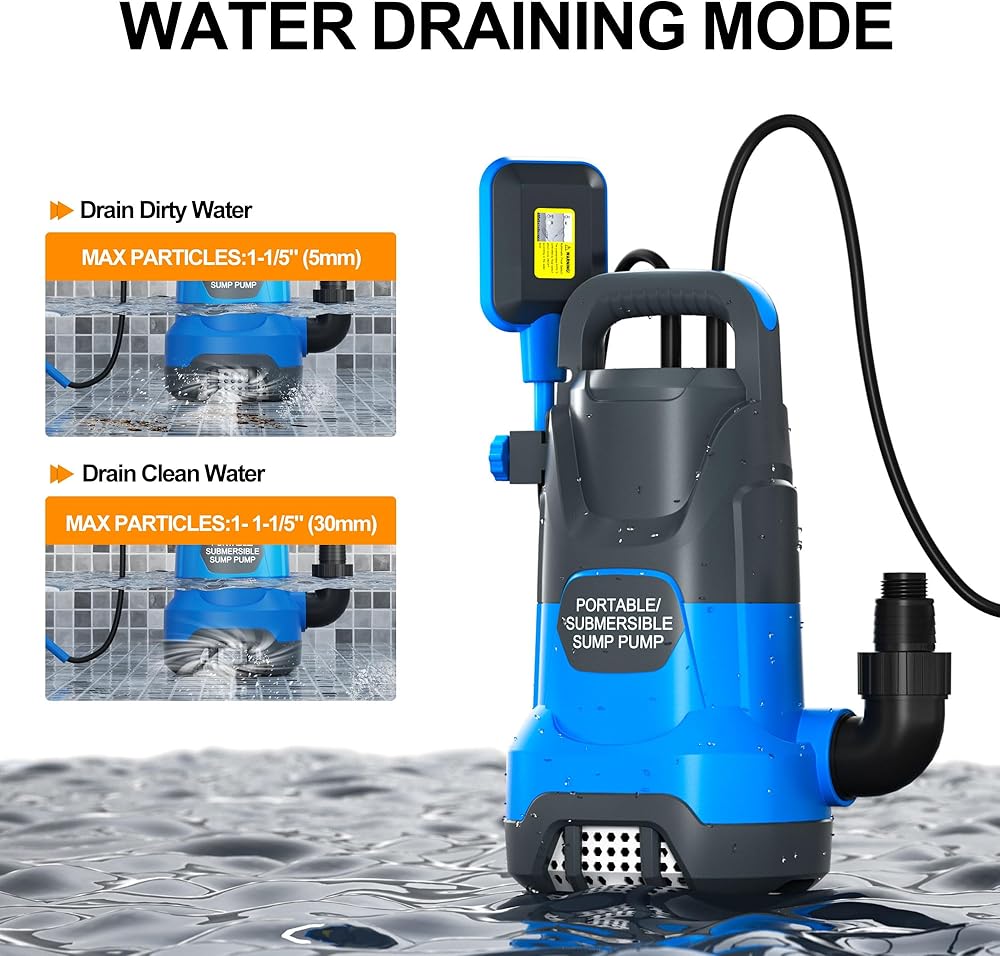 إزالة الماء بكفاءة: توفر مضخة المياه الغاطسة بمحرك بقوة 1 حصان تدفقًا عاليًا وتصريفًا سريعًا. تصريف المياه حتى 4000 جالون في الساعة على ارتفاع 5 أقدام. تعمل مضخة نقل المياه هذه بسلاسة دون إهدار الكثير من الكهرباء. يساعدك على القيام بأي مهمة تصريف بكل سهولة