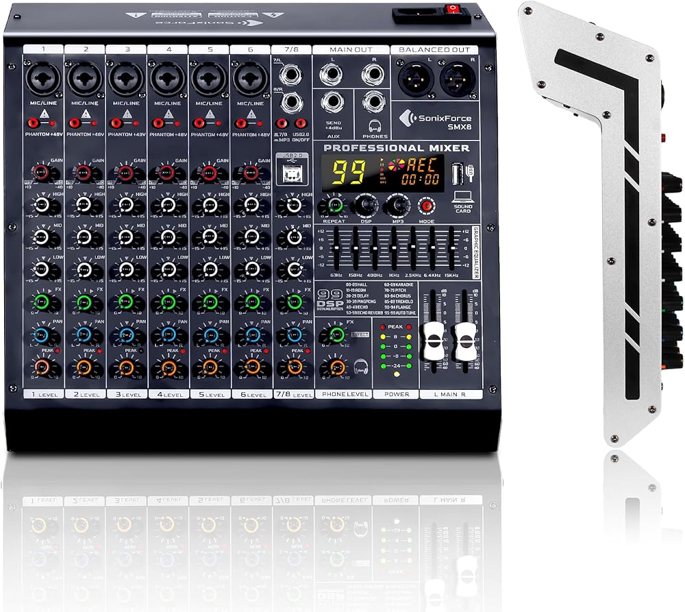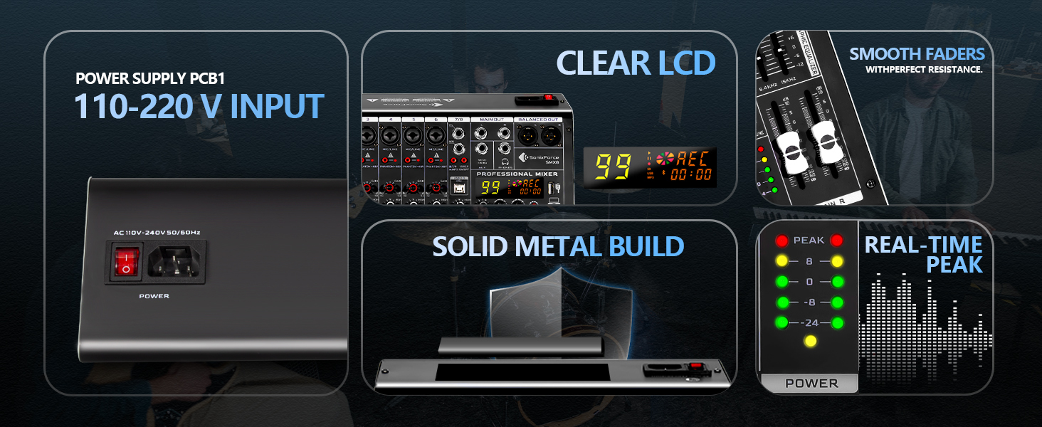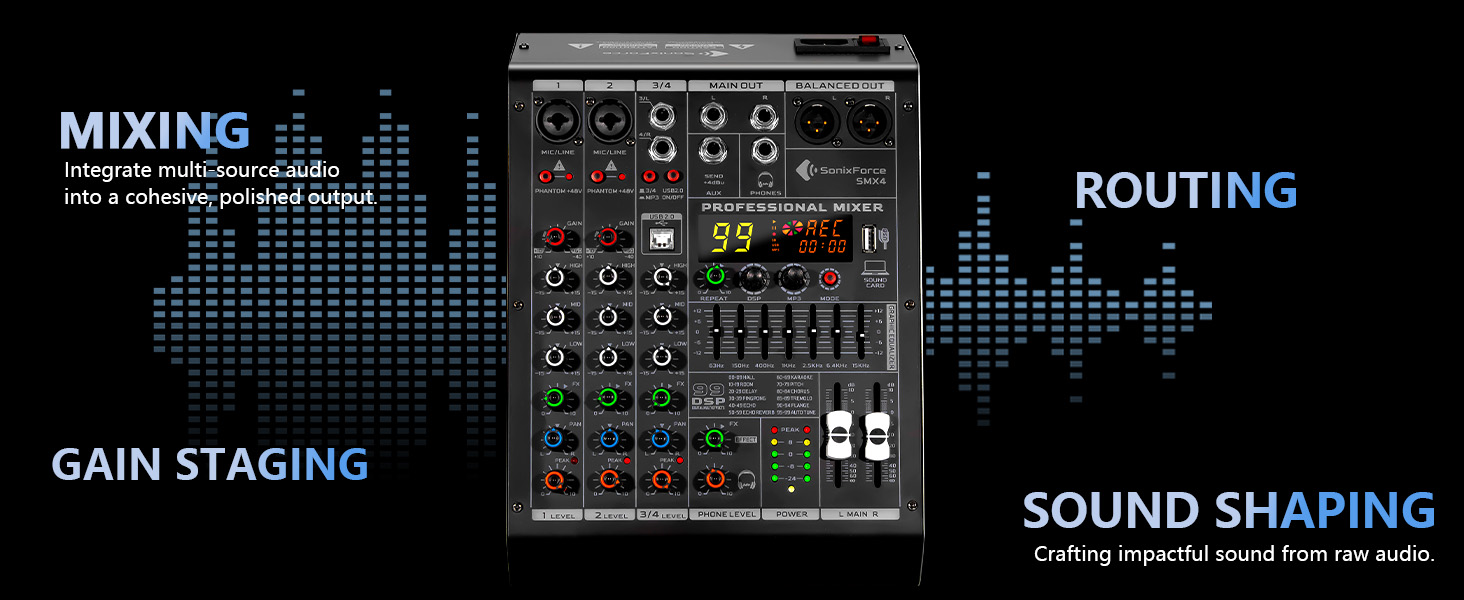 【خلاط ذو 4 قنوات】- تعامل مع إعدادات الصوت المعقدة بسهولة. تم تجهيز خلاط SonixForce بمقبسين XLR/TRS كومبو من فئة الاستوديو وأدوات ومدخلين خط ستيريو مخصصين، مما يوفر منصة مثالية للبودكاست متعددة الأشخاص، وتدفقات الفرقة الحية، وأي سيناريو يتطلب ميكروفونات متعددة ومصادر صوت في وقت واحد.
