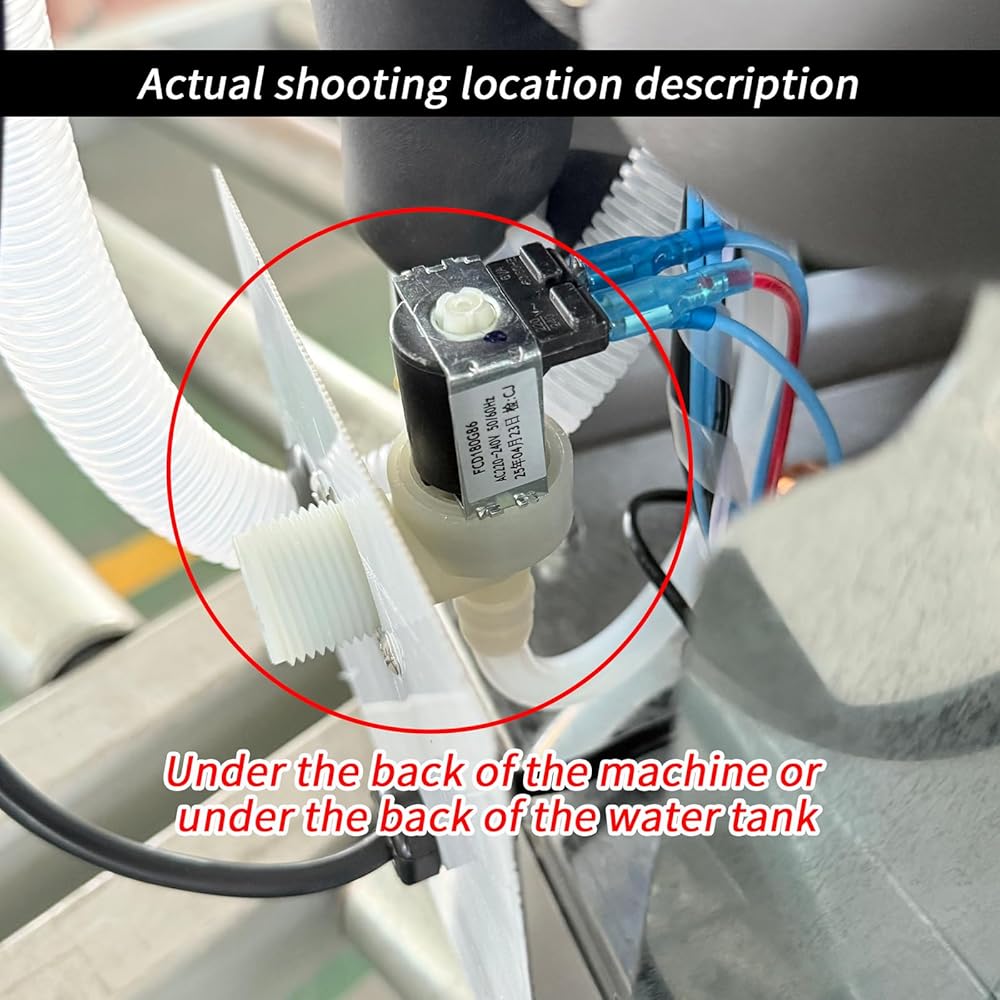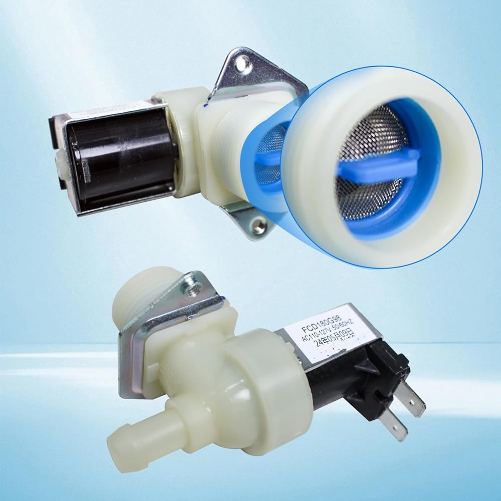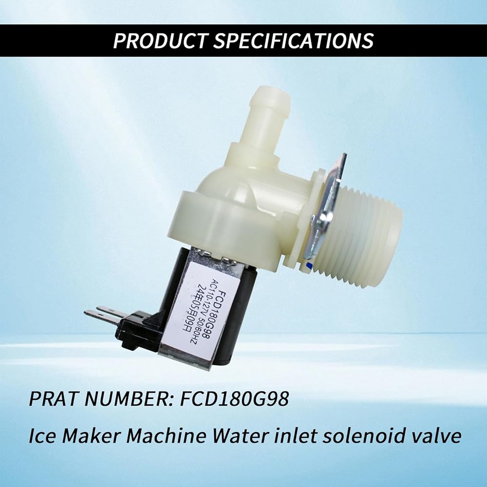 Wide Brand Compatibility: Universal replacement water inlet valve compatible with most ice maker brands. OE Number: FCD180G. Precise Water Inlet Control: Engineered with precision flow regulation technology to maintain stable water replenishment, ensuring consistent ice production cycles. Solenoid Switch Design: Features an AC electromagnetic valve with