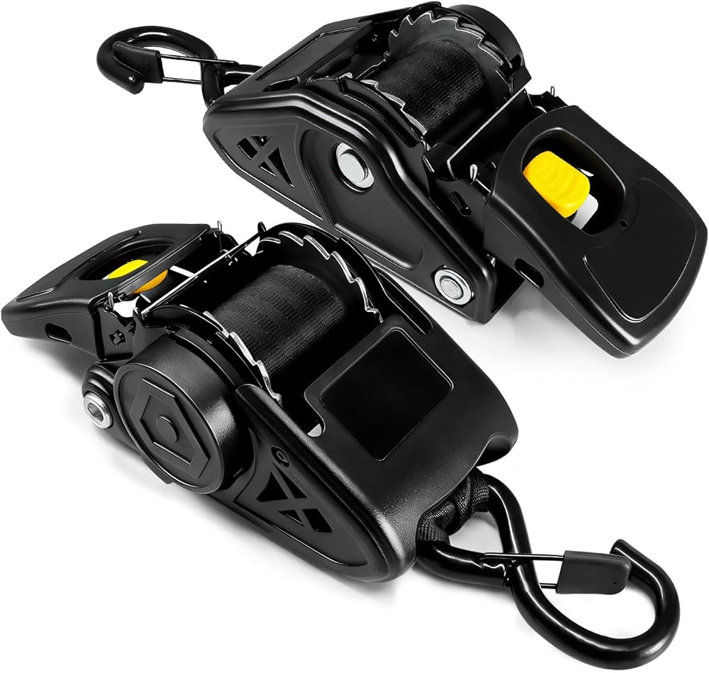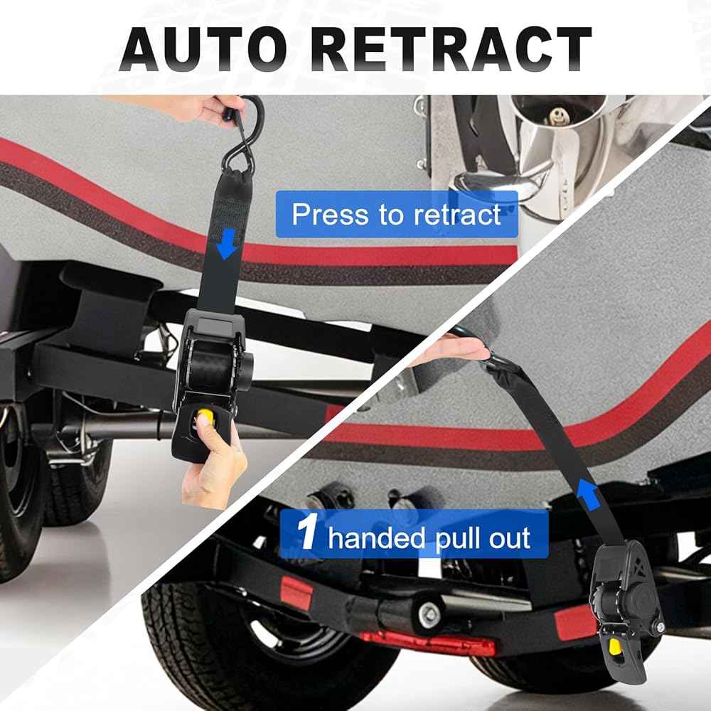 • 【حماية إضافية وسحب تلقائي】أجزاء ربط القارب القابلة للسحب والتركيب بطول 4.17 قدم مع إبزيم مطلي على شكل حرف S وأكمام واقية صفراء تقلل الاحتكاك وتحمي لمسة القارب الخاصة بك؛ اضغط على الزر الأصفر لسحب الحزام تلقائيًا، وتأمين الحمل، ومنع التشابك والسلامة