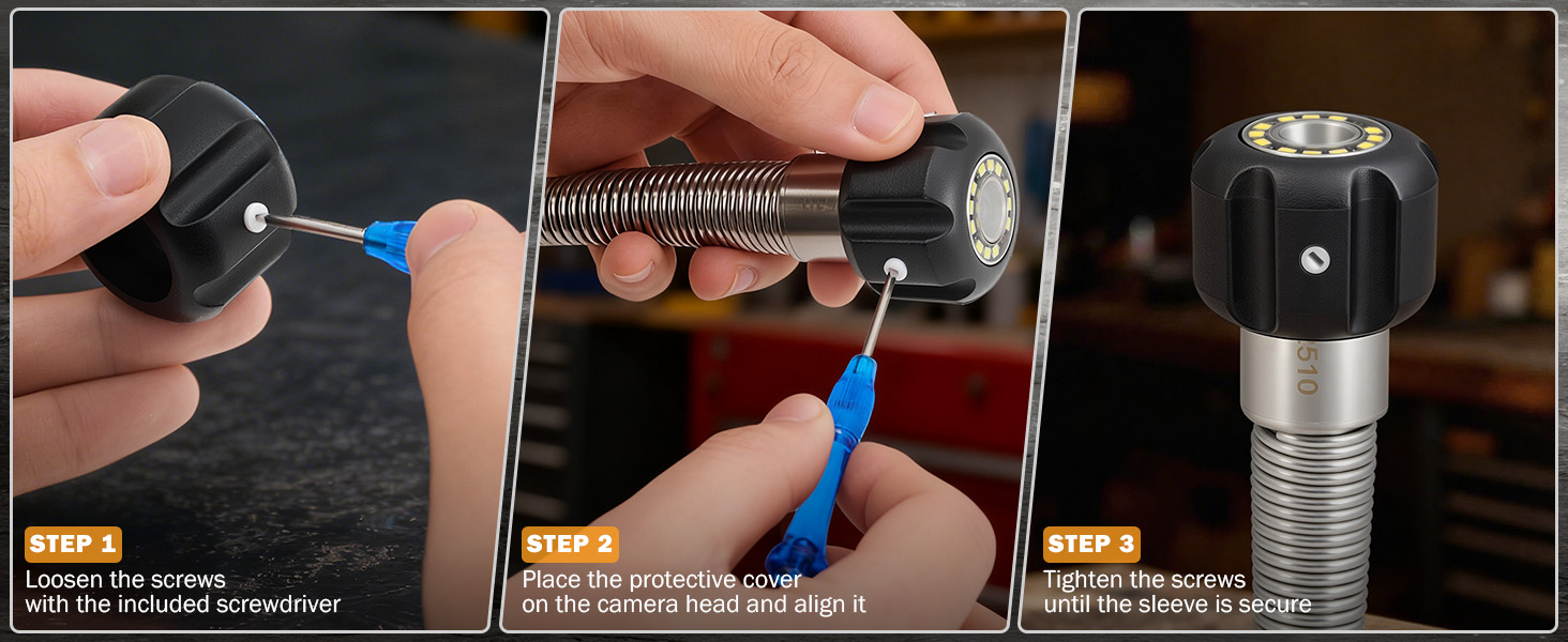 • سهولة التركيب: قم بتوصيل الغطاء الواقي لكاميرا الصرف الصحي برأس الكاميرا باستخدام مفك البراغي المتضمن لإعداد سريع وآمن، وجاهز لأي فحص