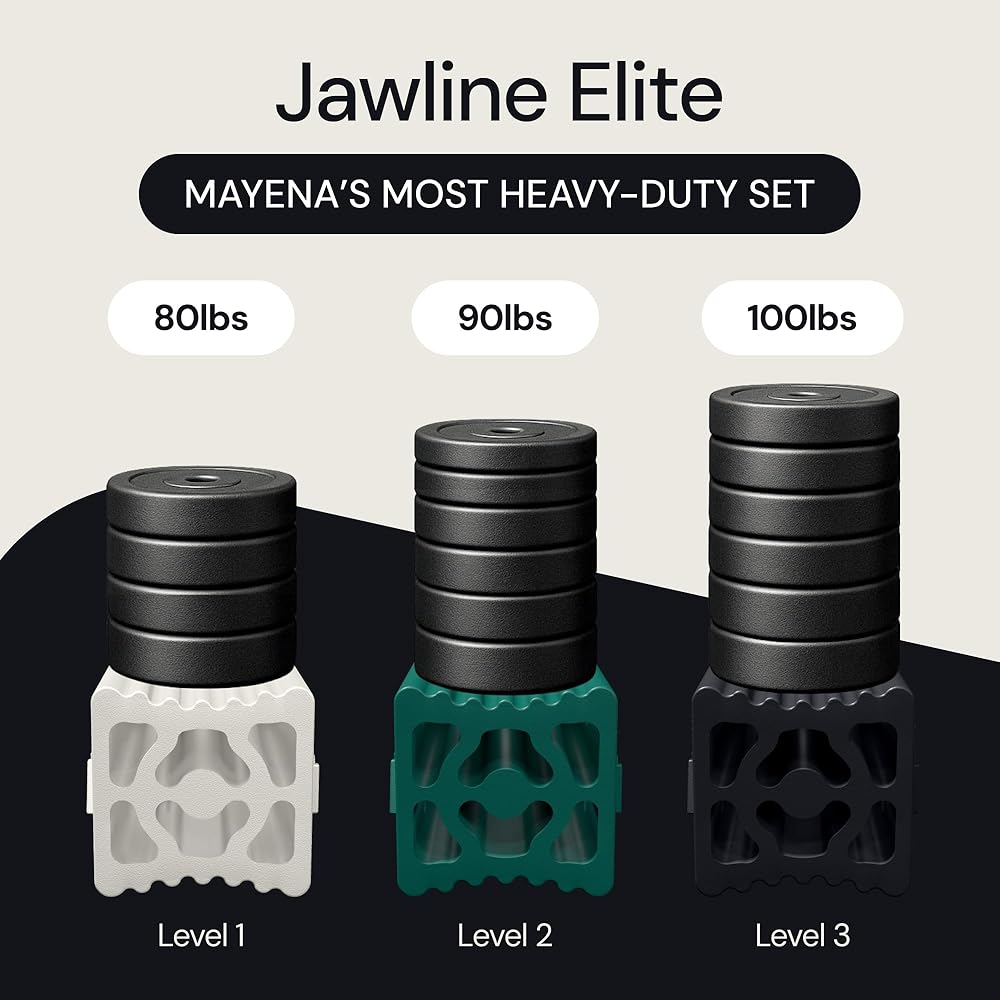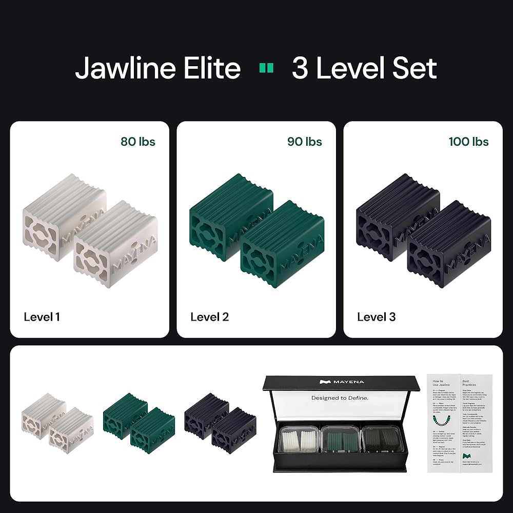 مجموعة تمارين الفك ELITE (80، 90، 100 رطل) + JAWLINE MAX GUM WATERMELON - مجموعة تمارين الفك عالية التحمل مصممة للمستخدمين ذوي الخبرة الذين يحتاجون إلى مقاومة أعلى، مقترنة بحزمة علكة شديدة الصلابة بنكهة البطيخ مكونة من 40 قطعة من أجل تحمل قوي للعض.