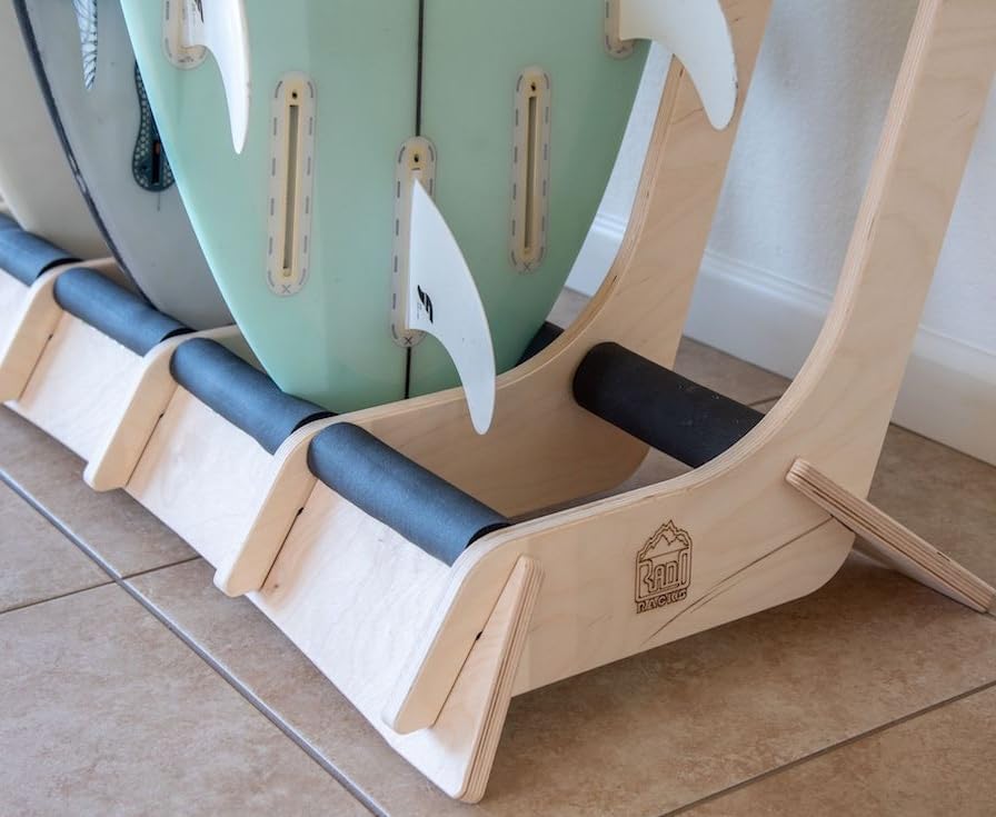 The Lineup freestanding floor display rack is the perfect rack for those with a quiver of surfboards that need a home. Made from 100% Baltic Birch, the Lineup is durable, functional, and artistic. This rack was engineered to be as strong as it is beautiful! The Lineup surfboard rack looks great in any living room, garage, surf shop, or shaping room. Thick padding on the bottom and side rails protect your boards' pressure points to prevent dings and extend the life of your boards. Can safely hold boards up to 10' long. Comes flat packed. Some very minor (and easy!) assembly is required.