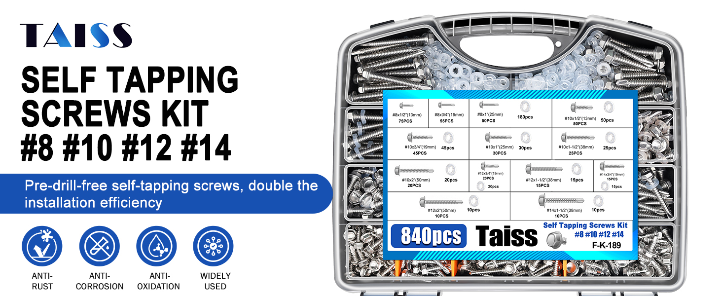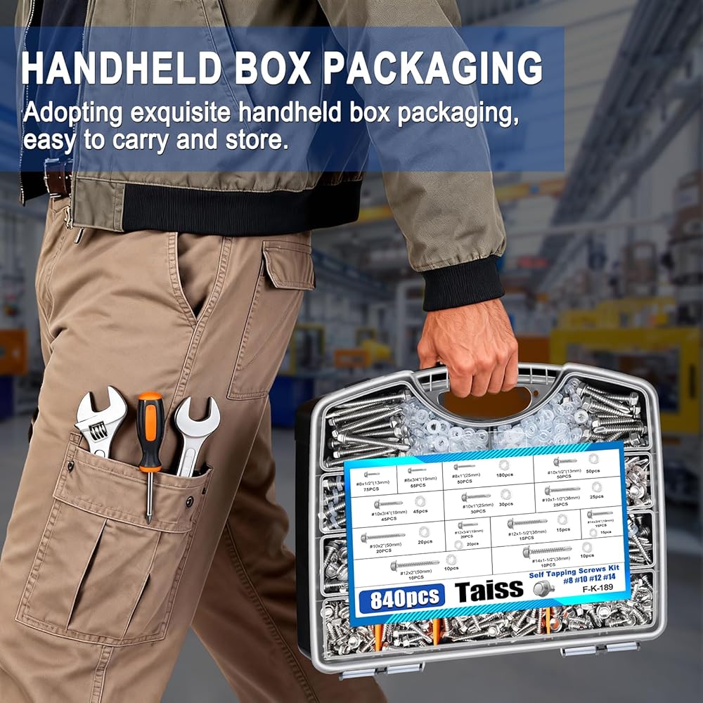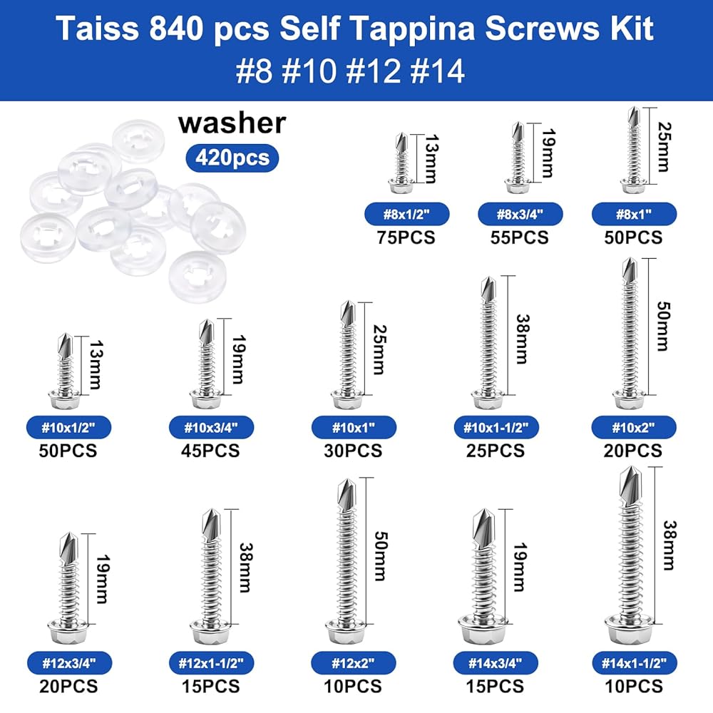Taiss 840 قطعة #8#10#12#14 براغي ذاتية اللصق للمعادن، 410 براغي معدنية من الفولاذ المقاوم للصدأ عالية القوة، براغي معدنية سريعة الصفائح، رأس غسالة سداسية ذاتي الحفر مع 420 قطعة من الغسالة المطاطية