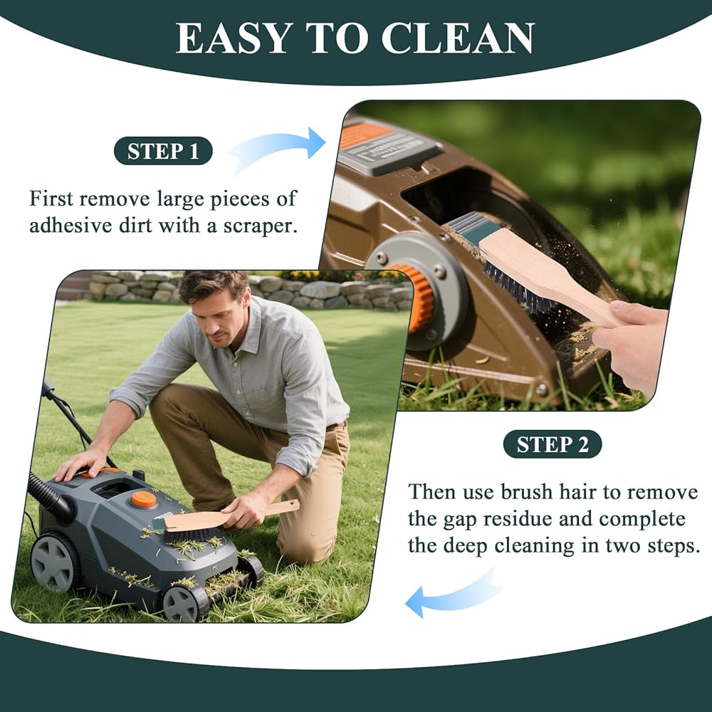 The compact body easily penetrates into the bottom of the lawn mower, narrow slits and other blind spots, and the wide scraper covers a larger cleaning area at one time to improve efficiency.