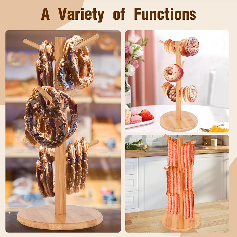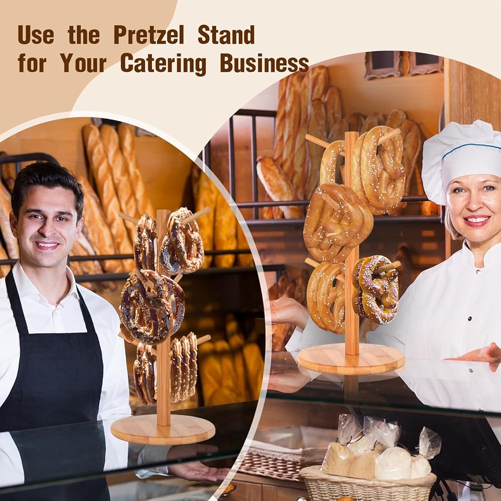 • Material: The Pretzel Holder Stand is made of bamboo, which is a natural and strong material, which is convenient for displaying Pretzel and Sausage. It is not suitable for falling, stable and durable