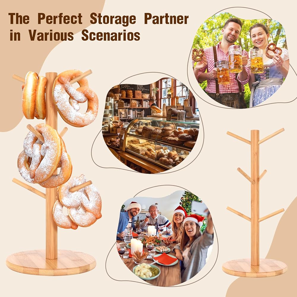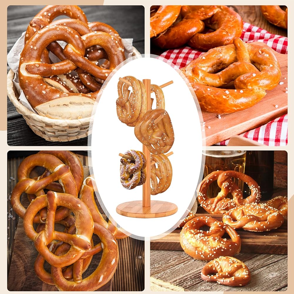 • Quantity available for display: The pretzel stand wood contains 6 branches for display, and the 6 branches are of different heights for display of different sizes of pretzel. Not only for pretzels but for cups and sausages and whatever else you want to show
