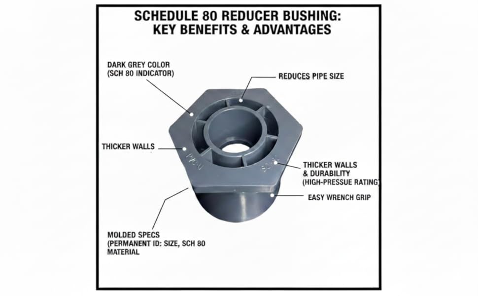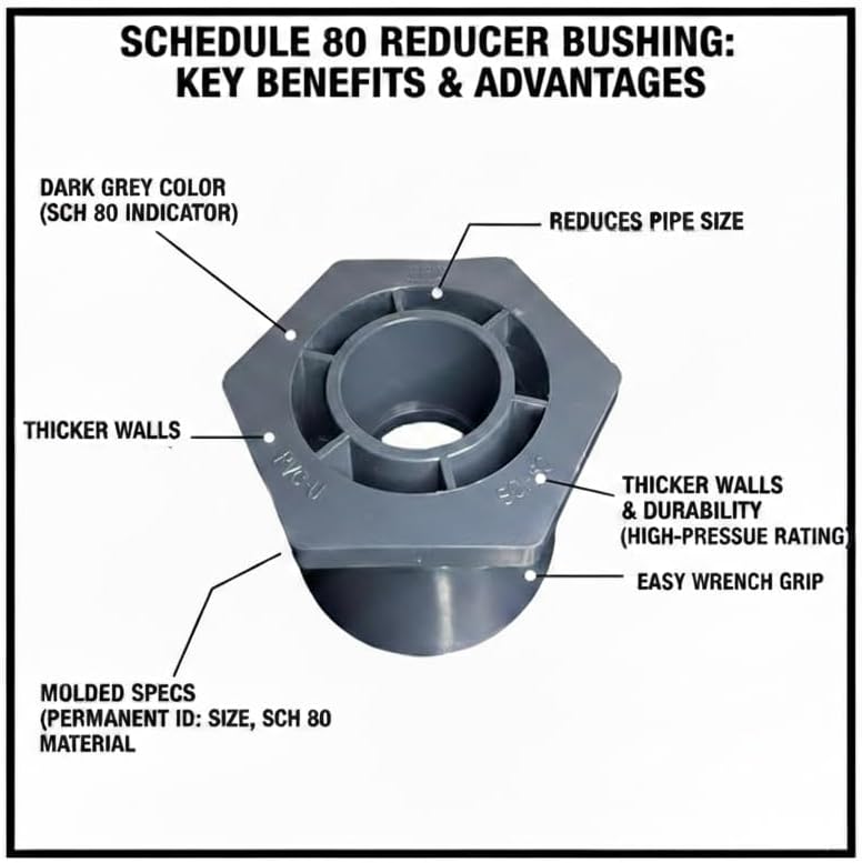 - هيكل من مادة PVC للخدمة الشاقة 80 - يوفر تصميم الجدار السميك معدلات ضغط أعلى ومتانة أكبر مقارنةً بتركيبات الجدول 40.