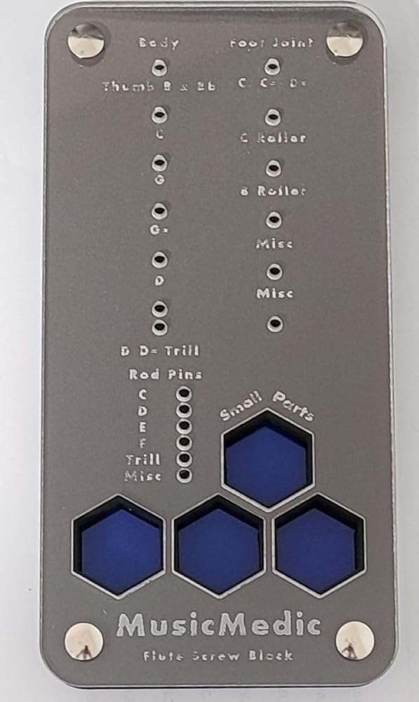 The Flute block is separated into Body and Foot Joint, and there are places for the most common rods and screws and a storage area for small parts. Rod Pins, or Knock Pins, can easily be stored in the block while the flute is disassembled. Each block has a convenient thru-hole to allow for storage on a nail or hook. The blocks are durable with a surface that is resistant to oils and grease. Dimensions: 7.13 x 2.8 x 0.73 inches (18 x 7 x 1.84 cm)