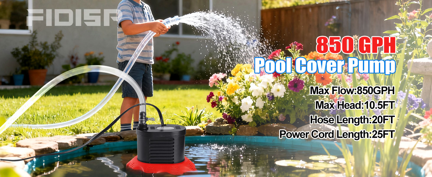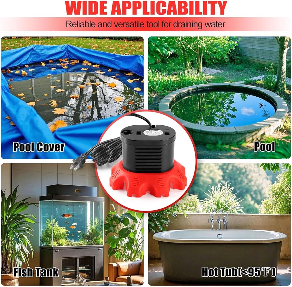 • مضخة قوية لتغطية حوض السباحة: يمكن لمضخة حوض السباحة تفريغ المياه حتى ارتفاع أقصى يصل إلى 10.5 بوصة وسرعة قصوى تبلغ 850 جيجا في الساعة، والتي يمكنها إزالة الماء بسهولة وكفاءة من أغطية حمام السباحة ومناسبة لإزالة الماء من خزانات الأسماك وأحواض السمك وأحواض المياه الساخنة والأحواض.