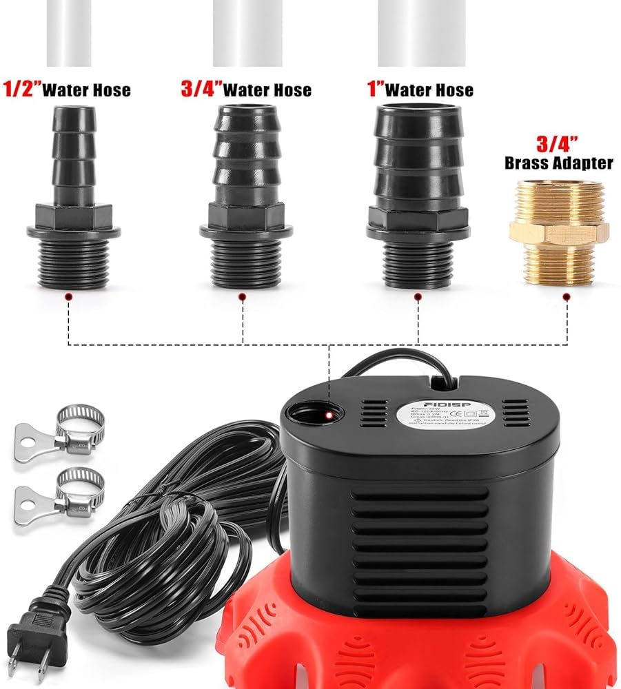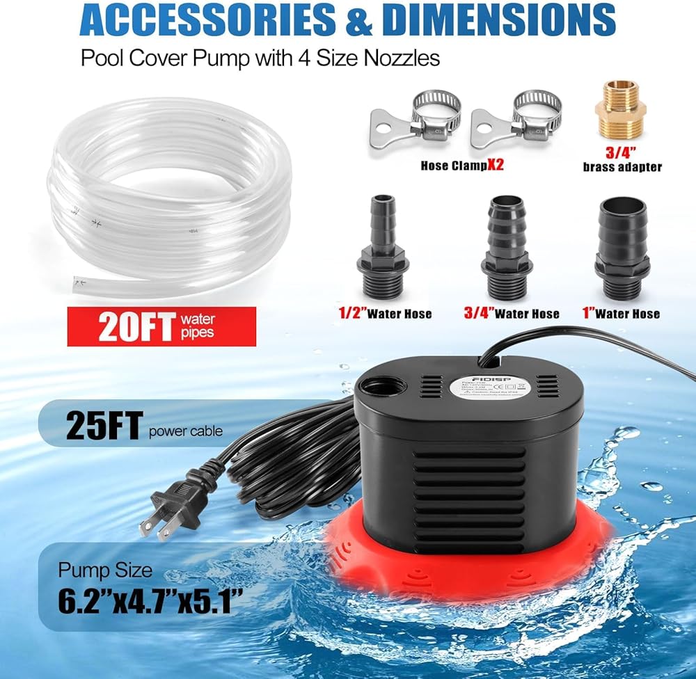 • تتضمن العبوة: مضخة مستنقع غاطسة مع سلك طاقة بطول 25 قدمًا، 4 محولات (1/2 بوصة، 3/4 بوصة، 1 بوصة، 3/4 بوصة محول نحاسي) لتناسب أحجام مختلفة من أنابيب المياه، خرطوم تصريف مرن بطول 20 قدمًا، مشبك خرطوم، وأكياس فلتر