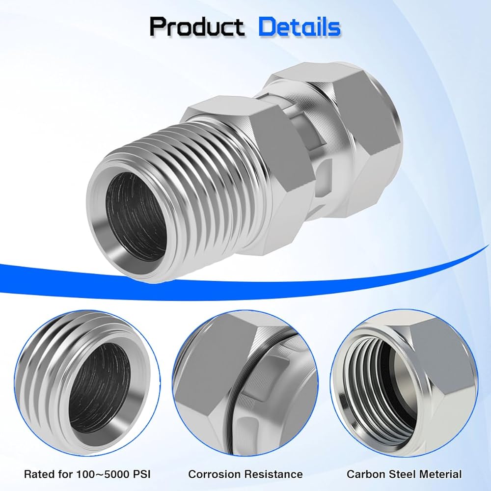 【Quality Craftsmanship】Constructed from high-grade carbon steel, this fitting provides superior tensile strength and resistance to pressure spikes and vibrations, Rated for 100~5000 PSI. The robust zinc plating offers excellent corrosion resistance, protecting against rust and wear in harsh environments, ensuring a long service life and reliable performance.