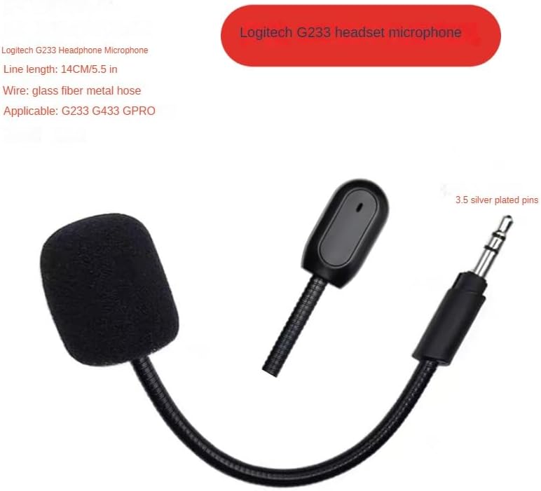 Upgrade your gaming audio setup with this replacement microphone specifically designed for Logitech G233, G433, and GPRO gaming headsets. The detachable boom microphone features a premium glass fiber metal hose construction for durability and optimal positioning. With a generous 14-centimeter (5.5-inch) cable length and 3.5mm silver-plated connector pins, this plug-and-play microphone ensures reliable voice communication during intense gaming sessions. The sleek black design maintains a professional aesthetic, while the foam windscreen helps reduce unwanted noise and plosive sounds. This direct replacement part maintains full compatibility with supported Logitech headset models, making it an essential backup or replacement for your gaming gear. The flexible boom arm allows for precise positioning to capture your voice clearly and consistently.