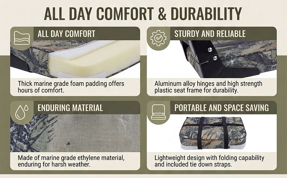 قوي وموثوق: تم تصميم مقعد القارب القابل للطي هذا للاستخدام المتكرر والبيئات البحرية القاسية، ويتميز بمفصلات من سبائك الألومنيوم وإطار مقعد بلاستيكي عالي القوة من أجل المتانة.