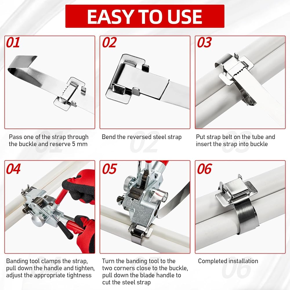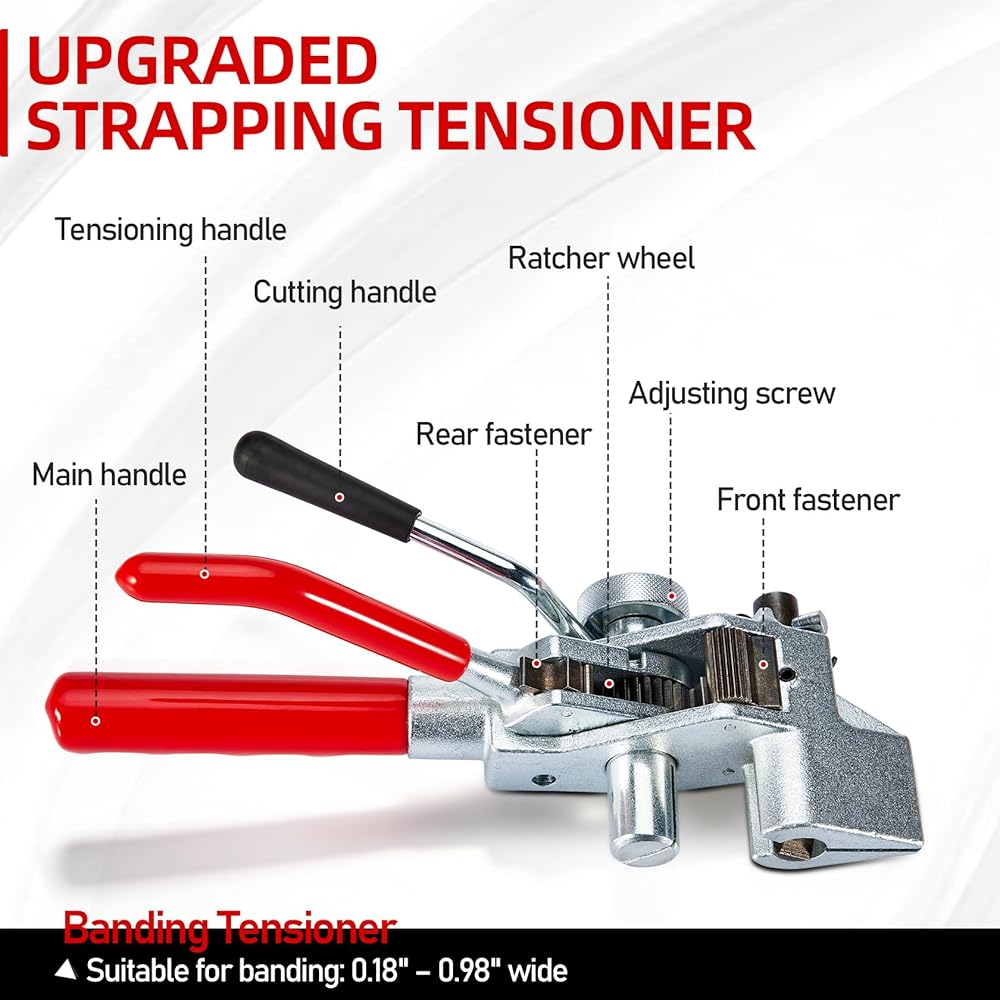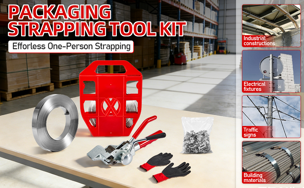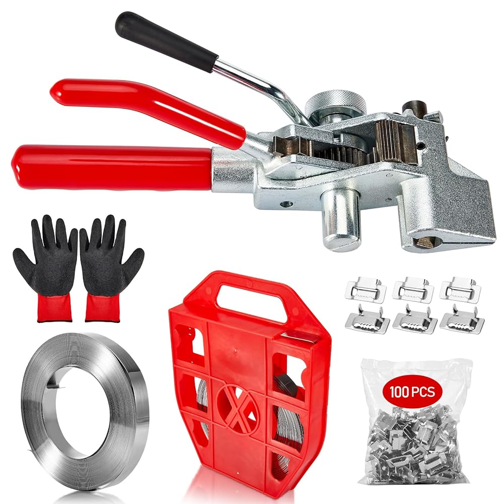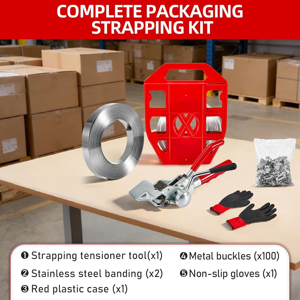تتضمن المجموعة الكاملة: تحتوي مجموعة أشرطة التغليف على قطعة واحدة من أدوات الشد والقطع، و2 لفافة من الفولاذ المقاوم للصدأ مقاس 3/4 بوصة × 100 قدم، و1 علبة بلاستيكية، و100 قطعة من الإبزيم المعدني، وزوج واحد من القفازات