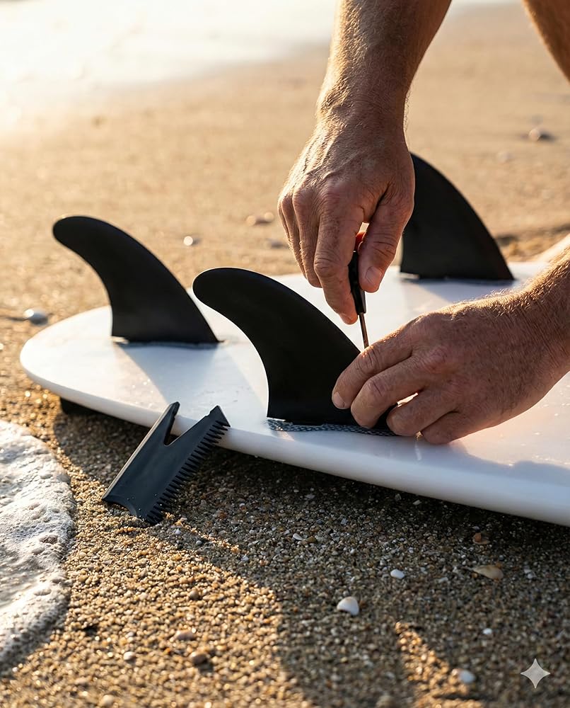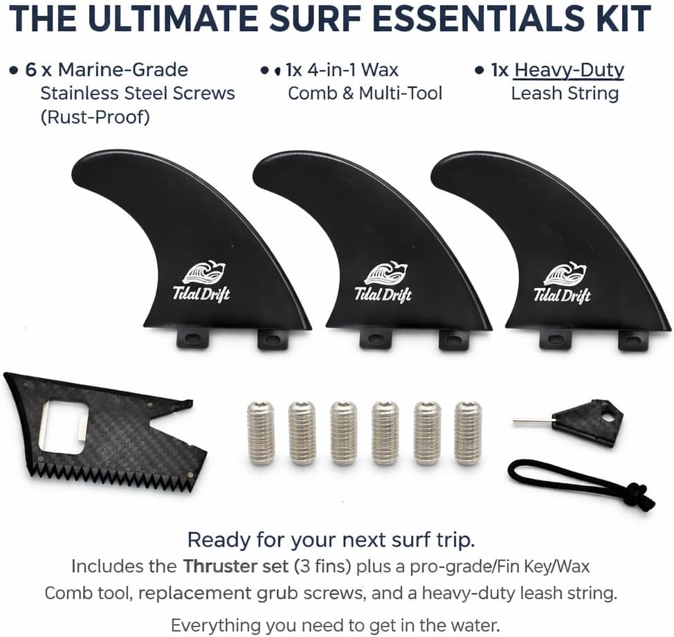 【مجموعة النجاة لركوب الأمواج】 توقف عن ترك المعدات المفقودة تدمر دورية الفجر الخاصة بك. نحن نضيف أداة احترافية متعددة 4 في 1 (مفتاح الزعانف، ومشط الشمع، ومكشطة، وفتاحة الزجاجات) بالإضافة إلى 6 براغي احتياطية من الفولاذ المقاوم للصدأ وسلسلة مقود احتياطية. تعمل هذه المجموعة على حل حالات الطوارئ على جانب الشاطئ حتى تتمكن من البقاء في الماء لفترة أطول