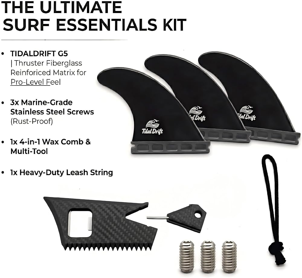 【المجموعة الكاملة الجاهزة للجلسة 🛠️】 نحن نعرف ما يحتاجه راكبو الأمواج. ولهذا السبب نحن لا نبيع لك الزعانف فحسب؛ نحن نقدم مجموعة كاملة جاهزة للجلسة. سواء كنت بحاجة إلى تبديل المسمار على الشاطئ أو فتح مشروب بارد بعد جلسة غروب الشمس، فإن أداتنا المتعددة 4 في 1 المتضمنة (مفتاح الزعانف، مشط الشمع، مكشطة، فتاحة الزجاجات) ستغطي احتياجاتك، بالإضافة إلى 3 براغي احتياطية مقاومة للصدأ وسلسلة احتياطية.