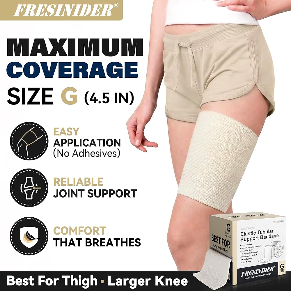 نظام المقاسات الطبي الاحترافي C–G - يستخدم FRESINIDER نطاقًا قياسيًا من C إلى G لضمان ملاءمة متسقة لمناطق الجسم المختلفة. يوصى بالمقاس G لتطبيقات الفخذ والركبة الأكبر حجمًا. للحصول على أفضل النتائج، قم بالقياس حول محيط المفصل قبل اختيار مقاسك.