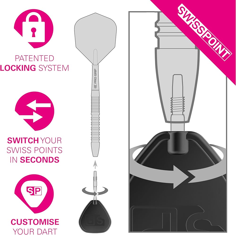 • CUSTOMISABLE SWISS POINT TECHNOLOGY: Switch dart points effortlessly with our patented Swiss Point locking system; taper and thread technology for securely locked-in dart tips. Use the pocket-sized tool for quick customization of your dart sets. Just as easy as changing your shafts and flights.