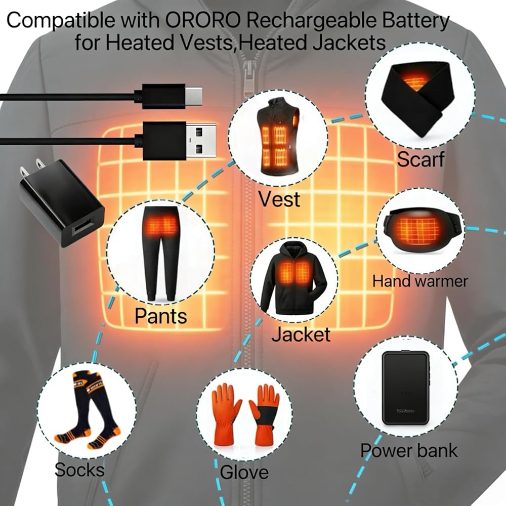 Compatibility: Specifically designed for ororo heated vest batteries, for women and men heated jackets, hoodies, hand muff, seat, socks, scarf, gloves,ensuring safe and reliable charging performance