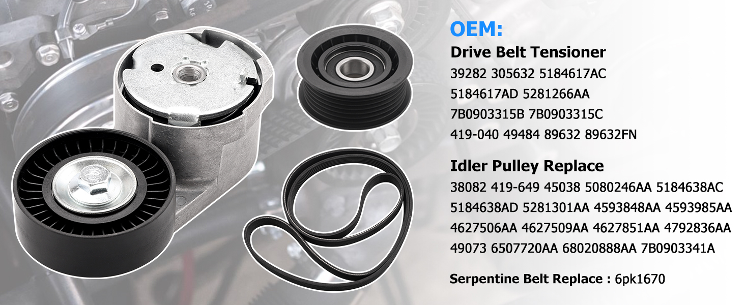 استبدال بكرة المهمل: 38082 419-649 45038 5080246AA 5184638AC 5184638AD 5281301AA 4593848AA 4593985AA 4627506AA 4627509AA 4627851AA 4792836AA 49073 6507720AA 68020888AA 7B0903341A استبدال الحزام الأفعواني: 6pk1670