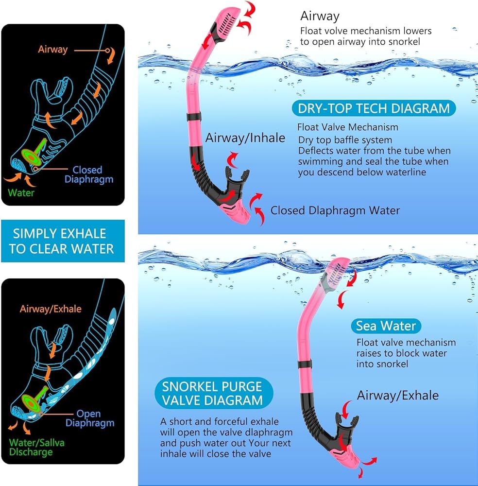 • 【Easy to Breathe Dry Snorkel】The Snorkel adopts the most stable dry float valve design and can be fixed on the snorkel mask by a buckle. When immersed in water, the snorkel is sealed to prevent water from entering the breathing tube, the lower purge valve can quickly drain the water. Which is a great safety feature. so you can enjoy easy and unobstructed breathing while diving underwater.