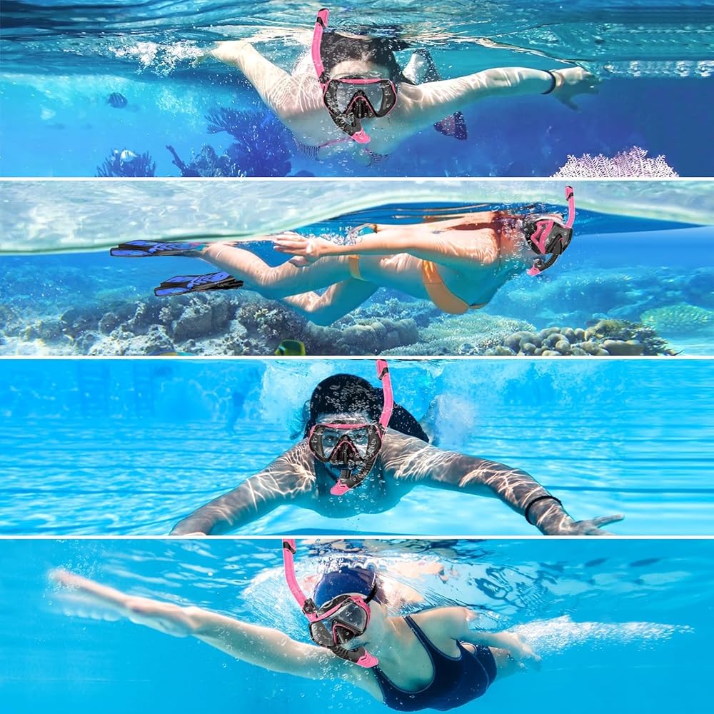 • 【Comfortable Silicone Skirt and Adjustable Head Mask Strap】Made of soft food-grade liquid silicone, the skirt of the swim mask will not cause pressure on the face, fitting the face perfectly to prevent water leakage. The side adjustment mask strap buckle is convenient, gently press to adjust the length of the mask strap for different head shapes.