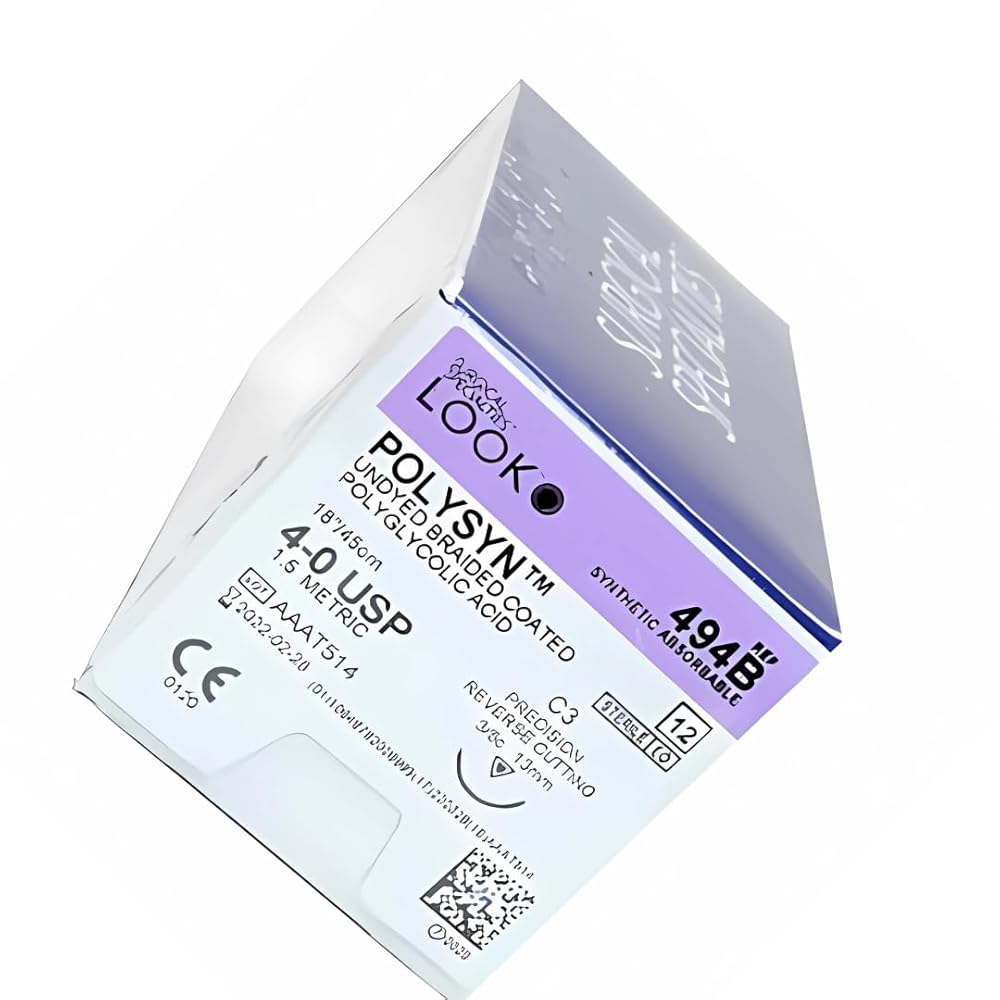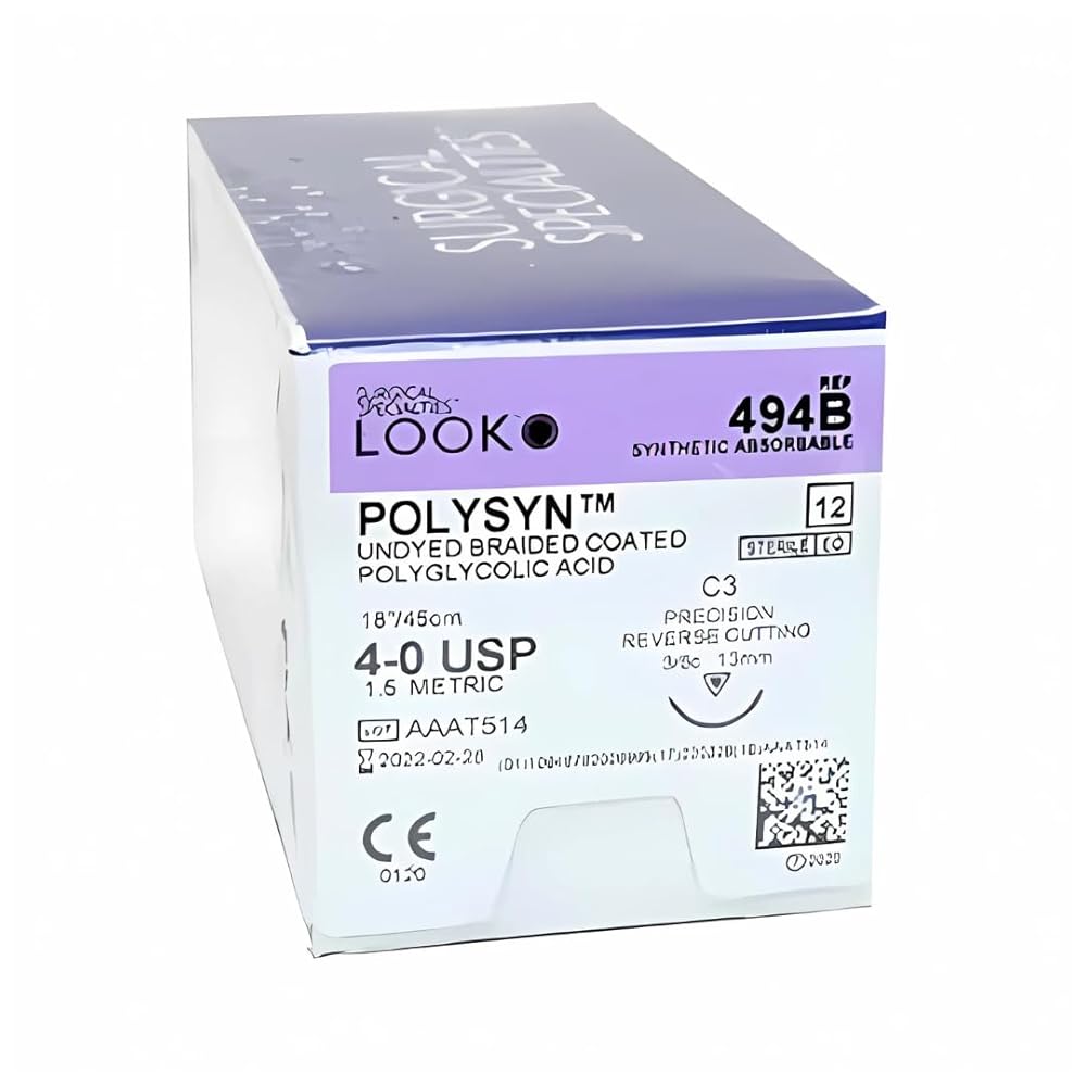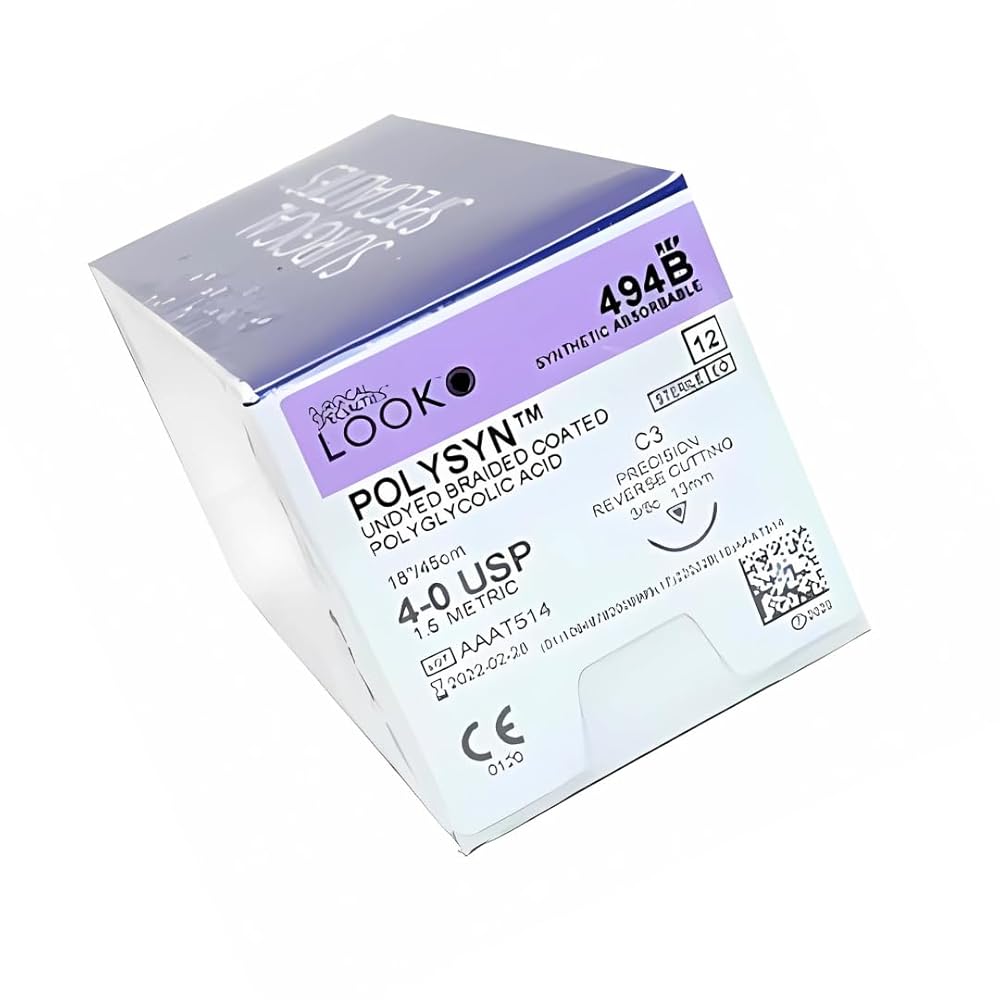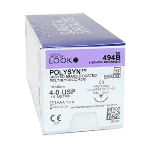 4/0, 18" vicryl undyed braided absorbable suture with reverse-cutting C-3, box of 12 suture sets. Undyed sutures that serve multiple purposes. Minimizes tissue drag with its smooth, low-friction coating. Retains 50% initial strength up to 2 weeks and 20% up to 3 weeks. Sold with C3 needle measuring 13 mm and with 3/8 circle curvature. 4-0 PolySyn Polyglycolic Acid Braided Sutures are absorbable sutures intended for the periodontal flap, wound closure, and connective tissue graft procedures. These sterile sutures measure 18" per pack, easily penetrate tissues, and have excellent ductile strength.These breakage-resistant sutures are easily maneuverable when placed inside the mouth. They are delivered using the C3 needle with a precision reverse cutting needlepoint type.