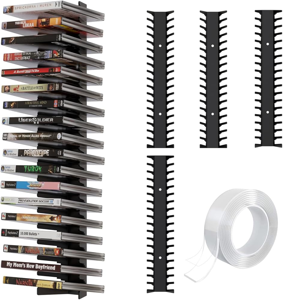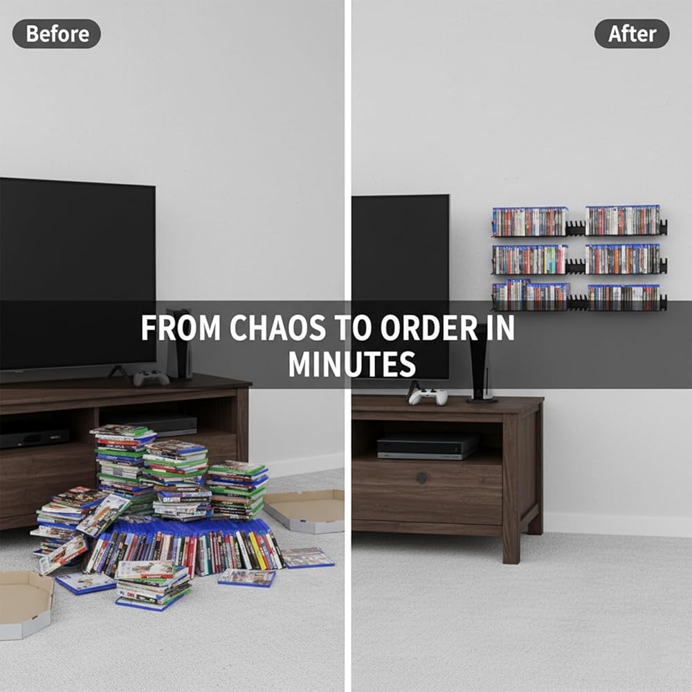 Transform any wall into a stylish display. The included mounting tape offers a clean, tool-free installation for a minimalist look. This dvd organizer and game organizer eliminates unsightly piles, saving valuable floor space while showcasing your library as part of your decor. It's the essential gaming storage upgrade and a standout media shelf for any room.