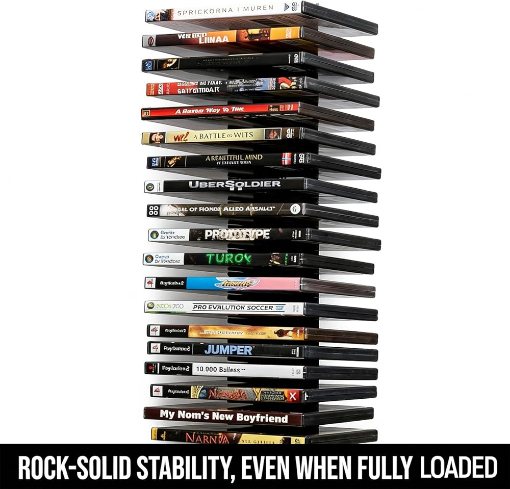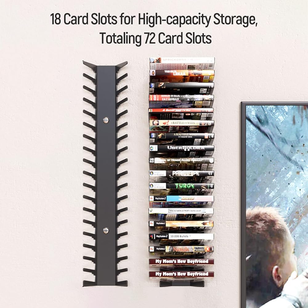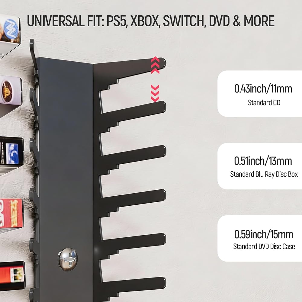 Crafted from durable metal with a sophisticated black finish, each video game shelf is designed to hold up to 18 standard cases. With a total capacity of 72 discs, this versatile unit functions seamlessly as a dvd storage rack, a blu ray storage tower, and a cd storage organizer. It's the perfect media storage hub for your ps5 games, Xbox titles, Switch cartridges, DVD collections, and more.
