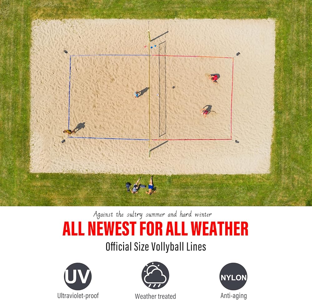 • 【مقاومة جميع الأحوال الجوية】تتمتع خطوط حدود الكرة الطائرة الرملية بتحسن كبير: مصنوعة من النايلون فائق المقاومة للتمزق، وهو معالج بشكل صارم للأشعة فوق البنفسجية ومضاد للشيخوخة والطقس؛ يتحمل جميع الأحوال الجوية والأماكن القاسية، مما يضمن عمرًا أطول وألوانًا تدوم طويلاً
