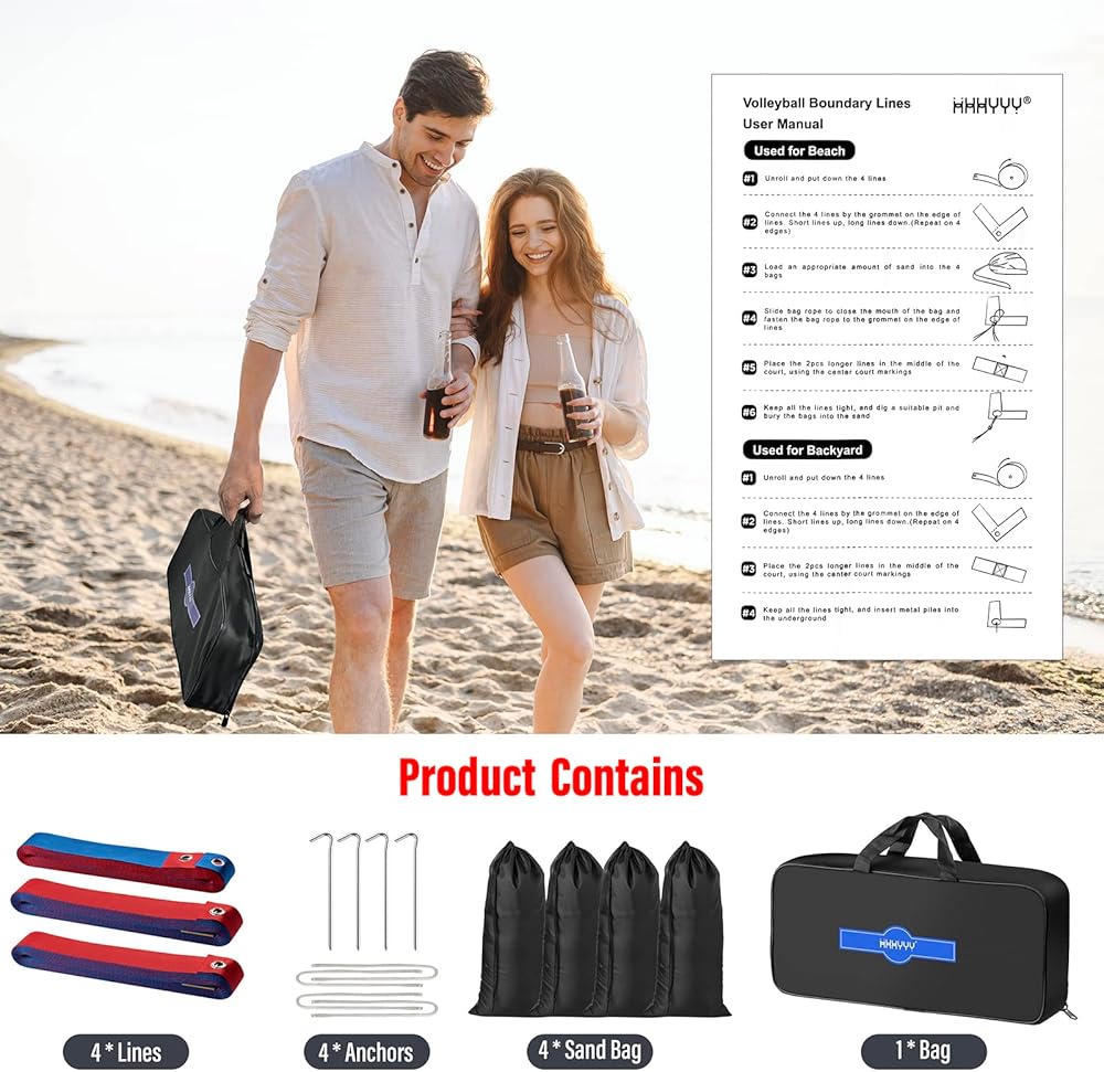 • 【سهلة الإعداد】تتميز خطوط الكرة الطائرة الشاطئية للعشب بتصميم مطور لعام 2025، وليست متشابكة، ببساطة قم بتركيبها في وقت قصير؛ 4 أكياس رمل تستخدم للشاطئ و4 أوتاد مقاومة للصدأ تستخدم للعشب؛ التعليمات سوف تساعدك أكثر