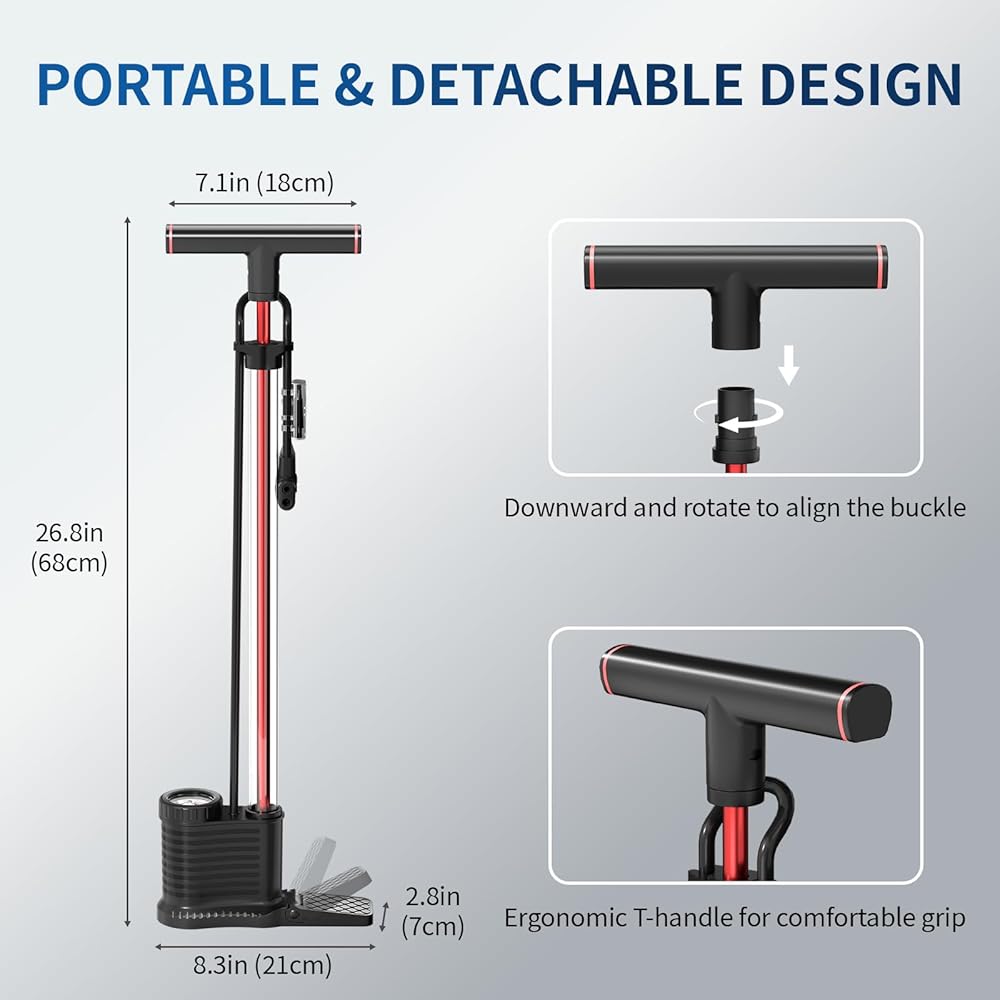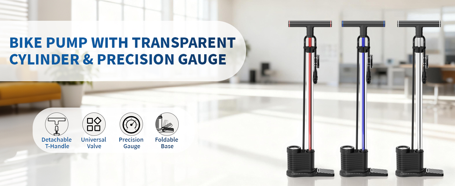 Compact, Stylish & Space-SavingFunctionality meets modern design. The unique transparent barrel makes a statement, while the intelligent layout makes storage a breeze. The base folds up neatly, and the handle is detachable, making this portable bike pump easy to store in a car trunk, garage cabinet, or closet. It is the essential bicycle accessory for every home.