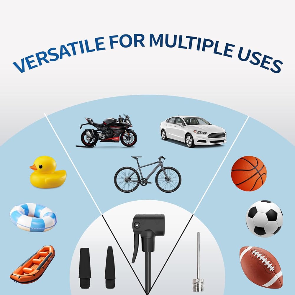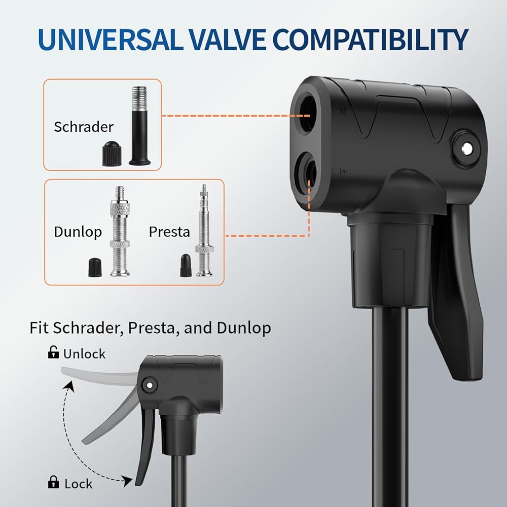 Universal Dual-Valve Compatibility (No Adapters Needed)Versatility is key. Our intuitive Dual-Valve Head features two clearly marked, distinct ports for Presta and Schrader valves. This design ensures a locked-on, airtight seal that prevents frustrating leaks, without the hassle of swapping adapters. From a professional road bike pump to a standard inflation tool for household items, it covers it all: