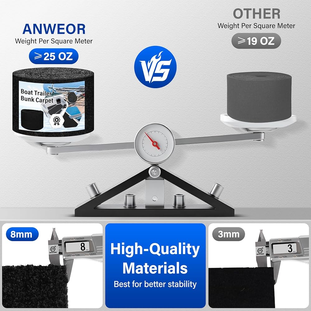 مادة عالية الجودة بوزن 25oz: سجادة مقطورة القارب مصنوعة من مادة بوليستر عالية الجودة، ويبلغ سمكها حوالي 8 مم، ناعمة وسمك بما يكفي للالتفاف حول مقطورة القارب، ويمكن أن يقبل الجزء الخلفي المناسب الغراء أو الترابط اللاصق
