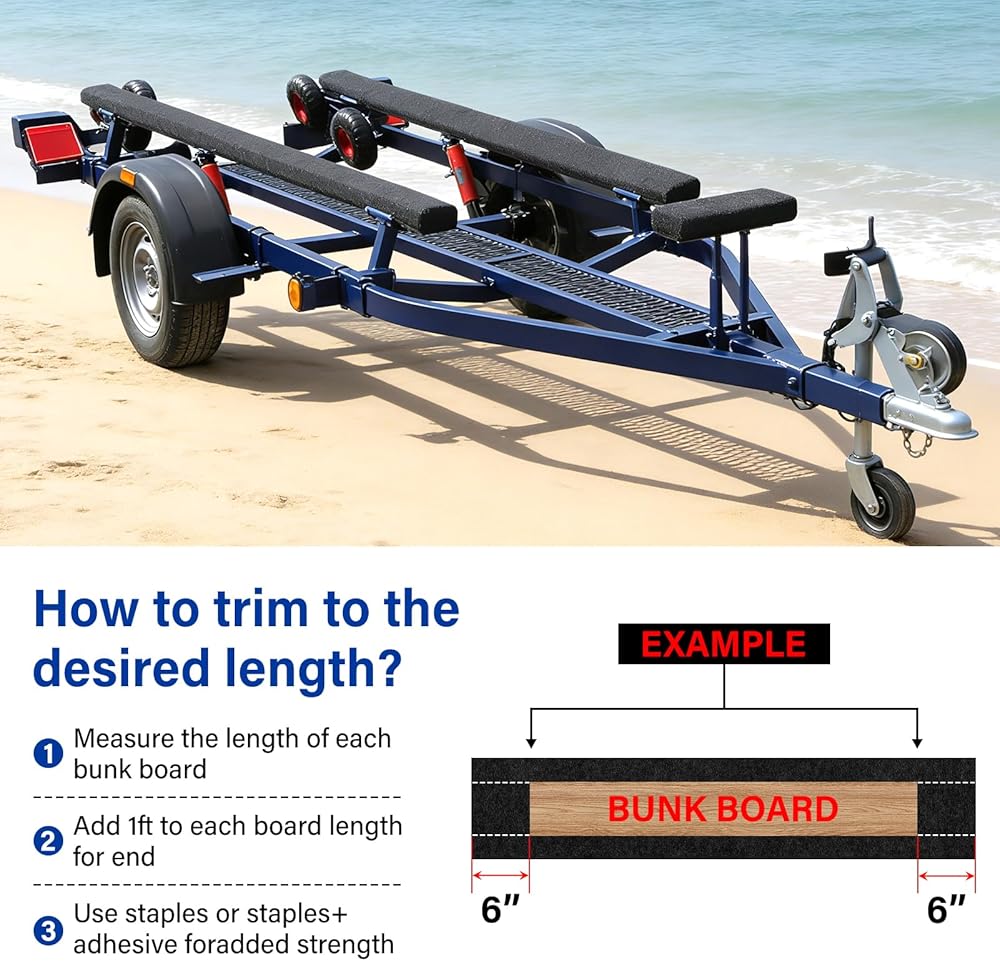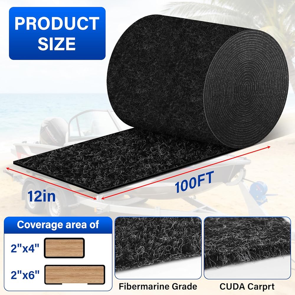 مقاسات مقطوعة مسبقًا، عرض كافٍ: يبلغ طول سجادة المقطورة 100 قدم، والعرض 12 بوصة. الطول الكبير يسمح لك بلف مقطورة القارب الخاصة بك بشكل مناسب، العرض المقطوع مسبقًا مناسب لتغطية كلا من طابقين 4x2 و6x2.