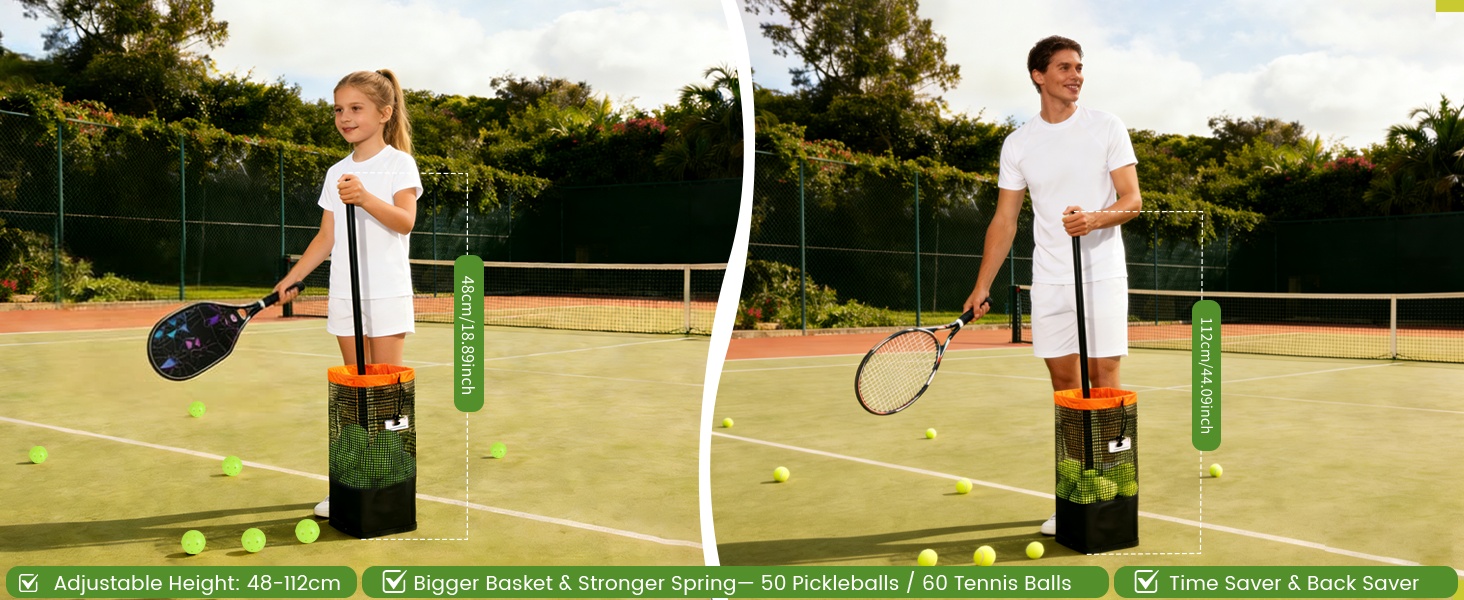 Heavy-Duty Spring & Adjustable Handle: Reinforced thicker springs ensure smooth ball pickup and long-lasting durability. The telescopic handle adjusts from 48–112cm, making it comfortable for players of different heights. For a more secure structure, the screw joint is designed with a tight fit. During the first installation it may feel slightly firm while tightening, ensuring stability and durability for long-term use.