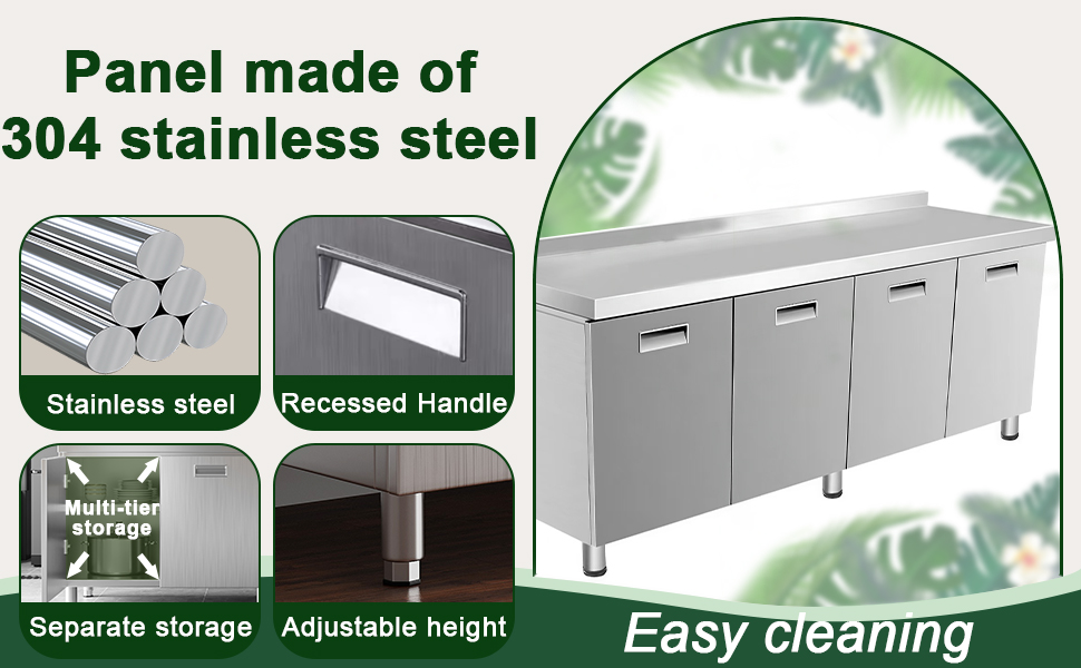 أقدام مرتفعة للتنظيف: هذه الخزانة المصنوعة من الفولاذ المقاوم للصدأ مجهزة بأقدام مرتفعة، مما يسمح بسهولة التنظيف أسفل الطاولة. يساعد الارتفاع الإضافي على منع تراكم الحطام، مما يضمن بيئة نظيفة مع جعل التنظيف الروتيني سهلاً.