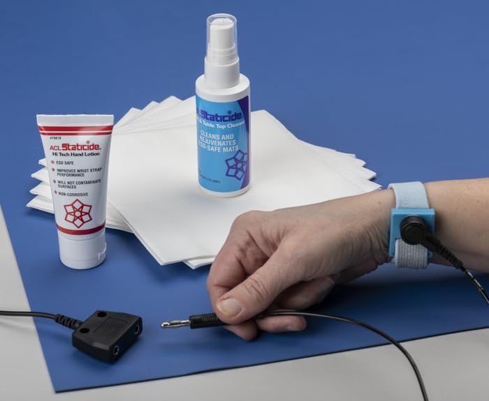 The Dualmat ESD Workbench Kit offers a great starting point for creating an ESD-safe work area. The kit uses a two-layer cross-linked anti-static rubber with an inherently dissipative top side and conductive bottom side, which allow charges to move safely away once the mat is grounded. The durable embossed material provides reduced parts slippage and resistance against most common solvents. Once assembled, this easy set-up is ready for high temperature soldering. Every kit includes a mat equipped with two female 10mm snaps installed for grounding points. The 10' grounding cord fits securely on one of the ground snaps and features two banana jacks as a plug-in for the supplied premium wrist strap and ground cord. Use the convenient ACL Hi Tech Hand Lotion to further ensure good skin-to-wrist strap contact for improved grounding practices. To maintain the electrical properties of the mat, use Staticide Mat & Table Top Cleaner with the LF50 Heavy Duty Wipes. This combination of neutral cleaner and low-lint wipes will leave the anti-static surface free of contaminants without harming the integrity of the mat. Designed for electronics assembly and PCB rework, repair, and prototyping, this grounding mat can be used in multiple applications including automotive, aerospace, defense, robotics, computer repair, or electronics manufacture. This kit is suitable for any EPA following ANSI/ESD S20.20 standards including STM 4.1. RoHS and REACH compliant.